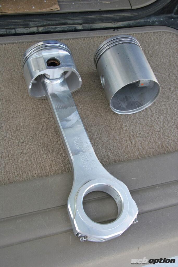 左がエンジンに組まれているコールデンロッド製コンロッド&CP製ピストン。右は1950年代のNASCAR用ピストンだそうだ。