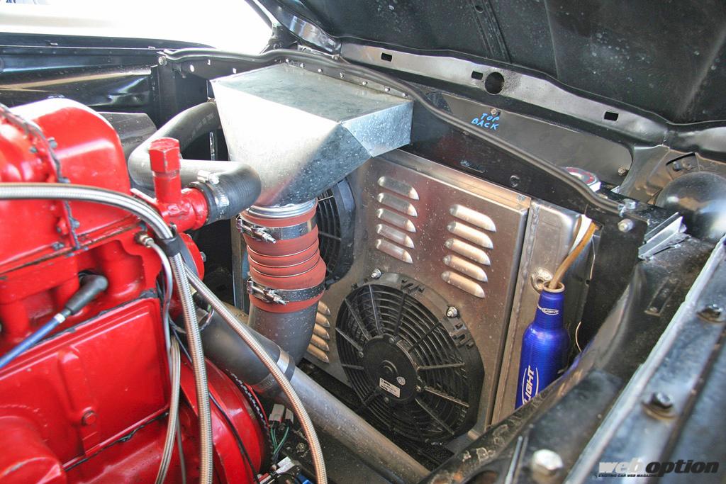 冷却系も独創的で、容量30ガロンの水タンクを搭載しながら一般的なラジエターも併用。背面をダクト付きのアルミカバーで覆って、対角線上にセットされた電動ファンで強制的に走行風を抜く。その上はインテークダクトだ。