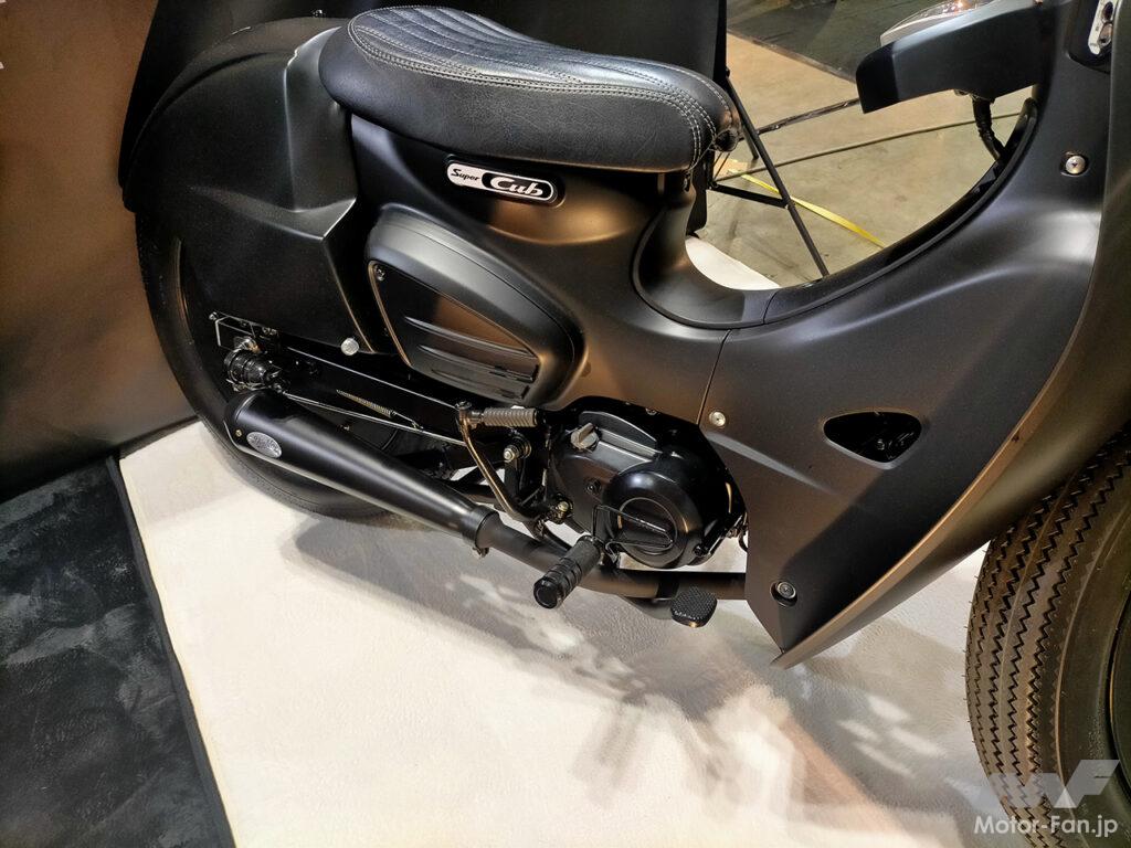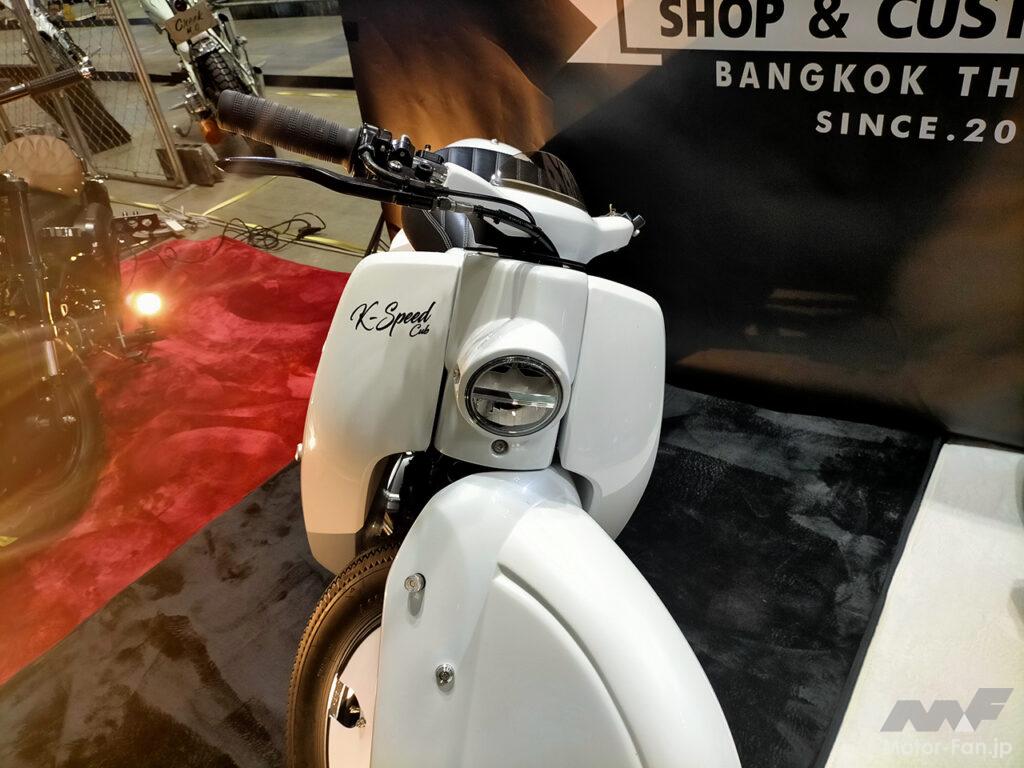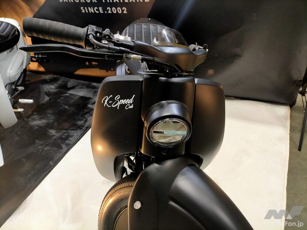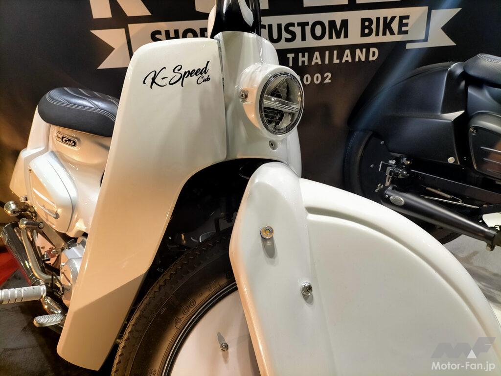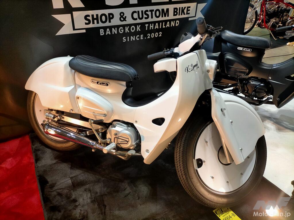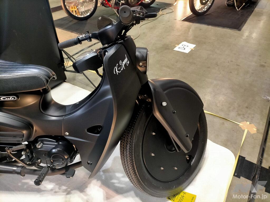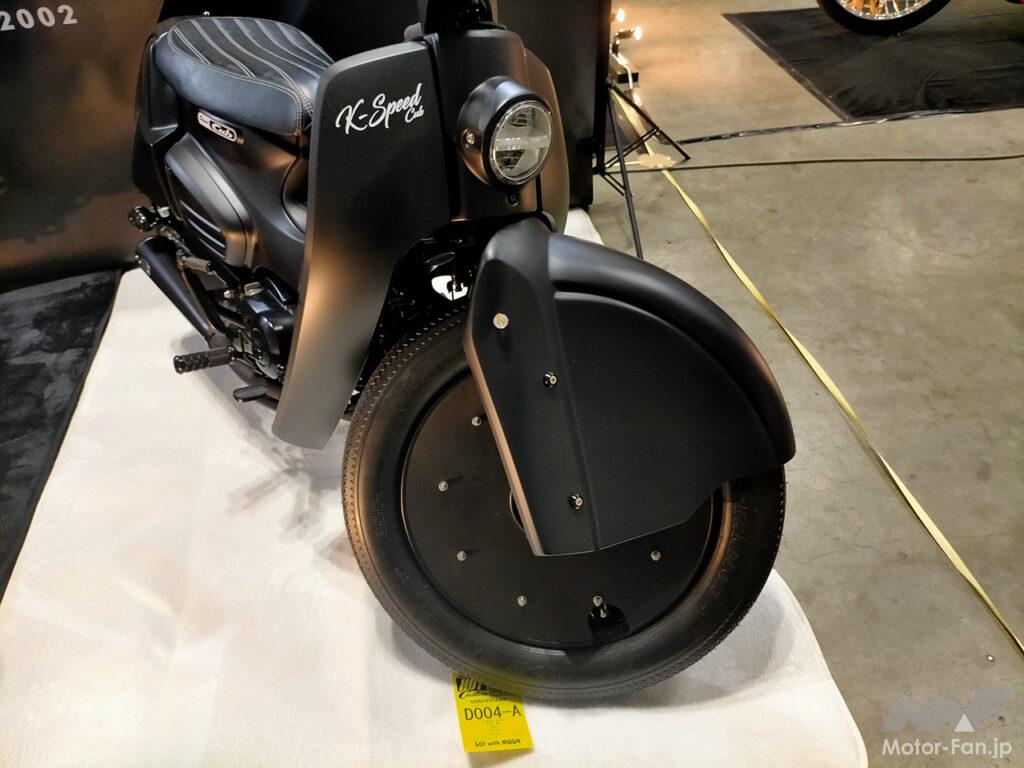 写真の「K-SPEED CUB」は、ホンダ・スーパーカブ110をベースに、ホイールを覆い尽くすような大型の前後フェンダー、ボディと同色のフルホイールカバー、クラシカルなイメージのカスタムシート、メガホンマフラーを装備してクラシカルなフォルムを演出。