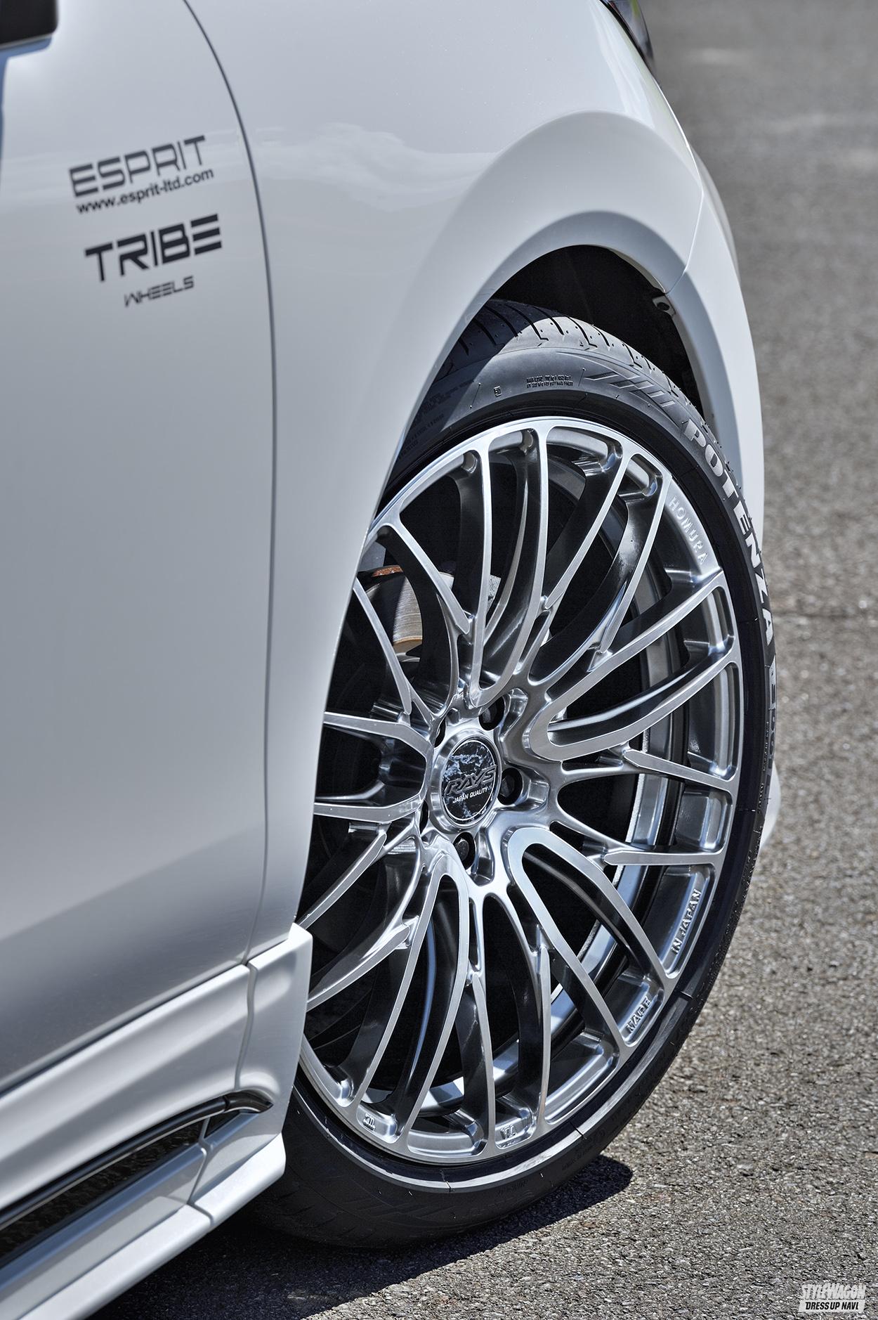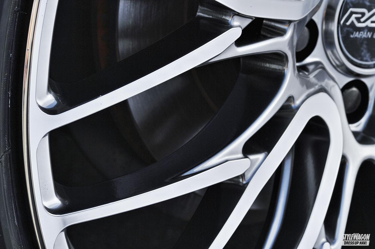 「メッシュはかくあるべき」という固定観念をブレイクスルーしたデザインがそれで、2×10BDは第2段となる。センターまわりに高低差を設けレイアウトした10クロススポークが最大の特長。2種類のメッシュが流麗に入り組むビヨンド・デザインにより、斬新な躍動感を演出。スポーク間にポケットを設けたり、ホールまわりを大きく落とすなど、立体感も強く打ち出す。さらに、センターキャップは大理石柄と、浮き上がるRAYSロゴをあしらったBDモデル専用。存在感高まる粋なパートとなっている。今モデルは超大口径21インチを設定するのもプレミアム感大。エスプリのデモカーとの親和性も極めて高い。
