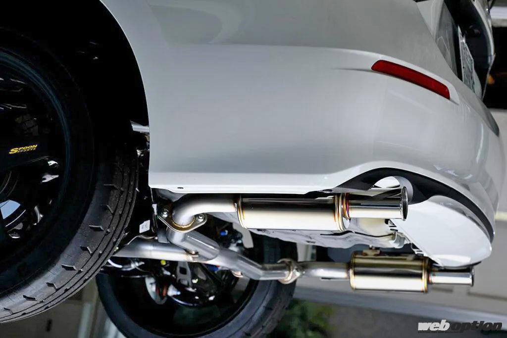 排気効率と消音性能を両立させたN1マフラーキット。Siに装着しているのはハッチバック用をベースにバンパー形状の違いに合わせてテール部を延長した試作品となる。