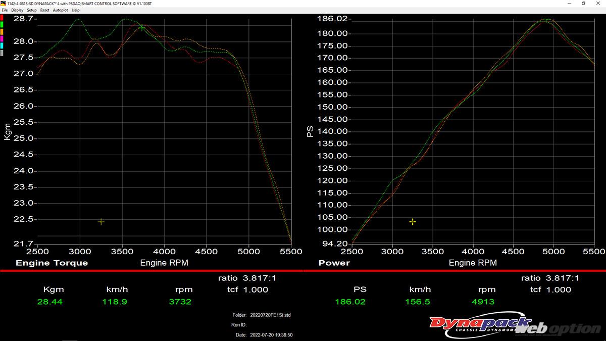 そんなSiに対し、スプーンは早くもファーストステップチューンを構築してきた。FE1型シビックSiに搭載されるL15CはFL1用のパワーアップ版で、カタログスペックの200psに対し実測は186psだった。そこにHONDATAを用いたブーストアップを施工。このHONDATAはFL1では約50psのエクストラパワー獲得を実現している。