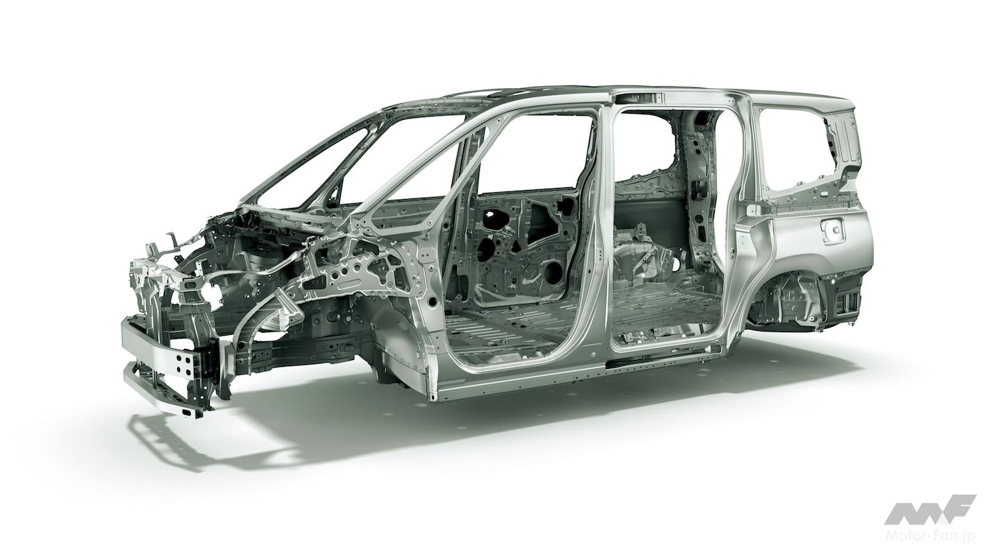 GA-Cプラットフォームについては、すでにたくさん語られているため、多くは説明しないが、CAEによる解析を駆使して骨格構造を最適化し、パワーユニット系の搭載位置や補機類のレイアウトも“低重心・低慣性”を目標に再構築されたもの。プリウス以降、C-HRやカローラシリーズ、レクサスUXなどにも展開されているが、ノア/ヴォクシーのそれは、リヤサスペンションがマルチリンク式からトーションビーム式へと変更されている。これは恐らく、軽量化とキャビンスペースの確保を狙ったものだ。
