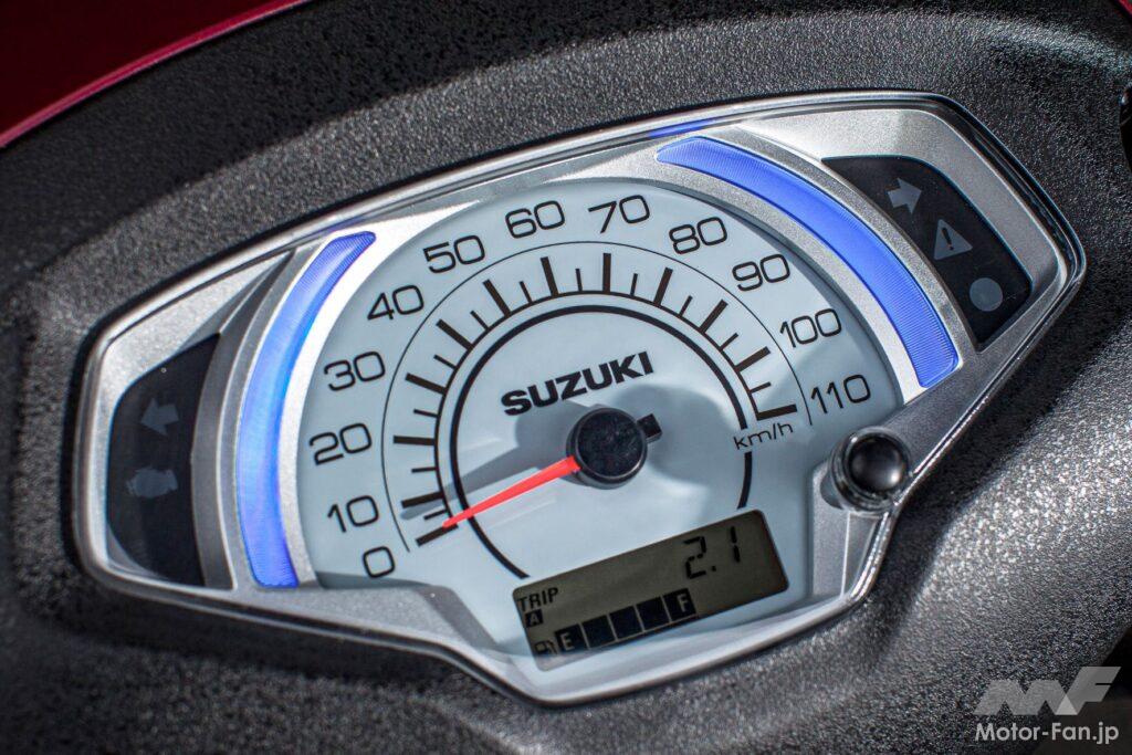 一方、アドレス125は日常的に乗るうえで便利な装備が充実している。USBソケットが標準装備されているほか、コンビニフックは前後に2か所設けられている。さらに、液晶ディスプレイは積算計、距離計、電圧計、時計が切り替え表示できるほか、燃費の良い運転をするとブルーからグリーンに発光色が変わるエコドライブイルミネーションも搭載。ヘッドライトは明るくて見やすい長寿命のLEDであり、フロントブレーキはディスク。ワンクリックでエンジンが始動するスズキイージースタートシステムまで採用するなど、差額1万8700円で埋められないほどの開きがあるといってもいいだろう。