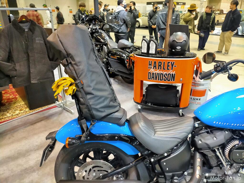 写真のStreet Bob 114は、タンデムシート部にロングタイプの大型バッグを装備。ロー&ロングスタイルのStreet Bob 114にもマッチするこの縦長バッグは、タンデムツーリング時、リアシートに乗車するパッセンジャーの背もたれになるのもポイント。