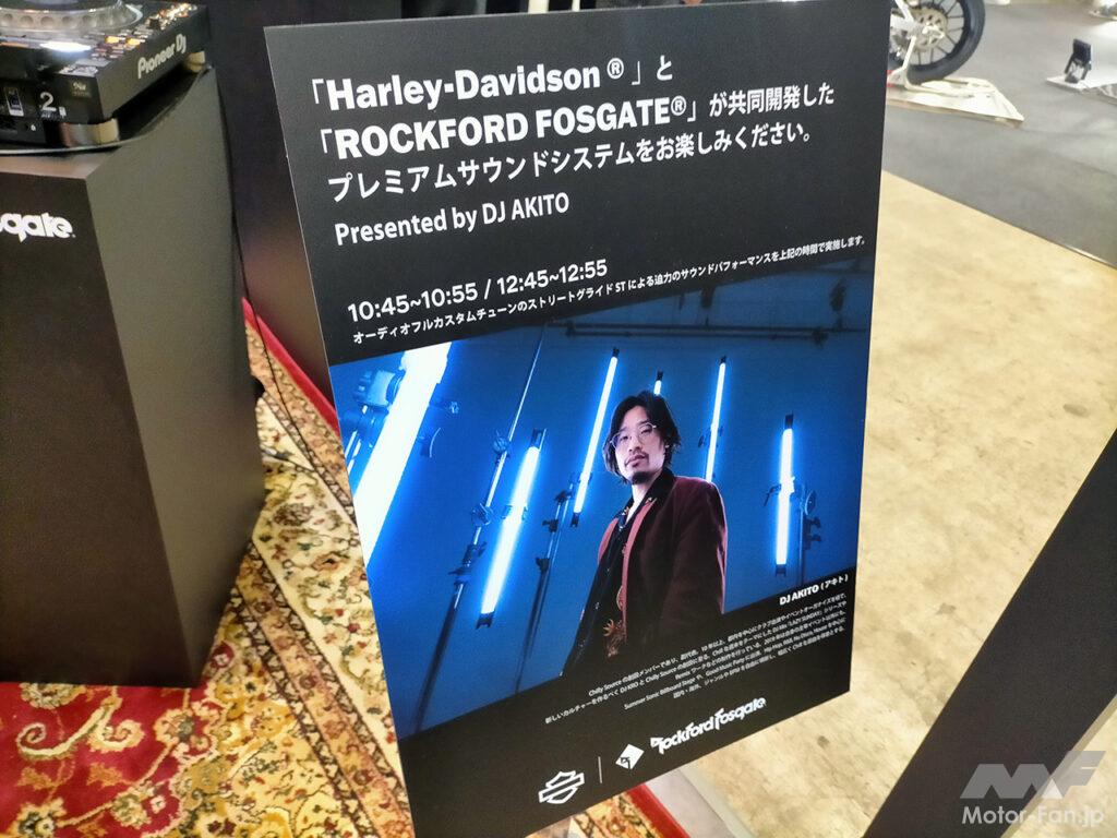 ビッグツアラーであるStreet Glide STのフロントカウル内、またリアサイドケースの上部に、雨天使用も可能な完全防水の高性能スピーカー等を搭載。イベント当日には人気DJ「DJ AKITO」によるサウンドパフォーマンスも開催。本場のテクノロジーを駆使した、最先端かつ良質の音質を披露した。