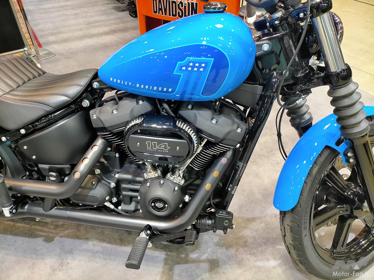 スピーカーなどの音響機器を導入した、上記の大型フロントカウル付きモデル「Street Glide ST」とは異なり、カウル類やケース類を排除した、ロー&ロングスタイルの「Street Bob 114」。680mmという低めに抑えられたシート高、長く伸びたフロントフォークなど、チョッパーカスタムのベースとしても人気のある、ハーレー伝統のアメリカンスタイルに設計されているのが特徴だ。