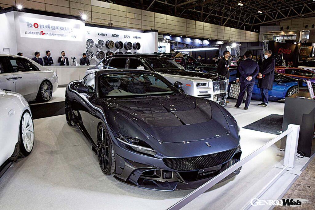 ボディパーツにホイールなどマンソリー一色に染められたローマが登場した。「世界でもっとも華やかでゴージャスなクルマを」として活動するマンソリーは、ローマの世界観と調和する。フロントまわりは専用のメッシュグリルとフィンを備えてアグレッシブな表情に。リヤのディフューザーもそれに通じるデザイン路線だ。なのに全体を通して見るとエレガント路線に思える。フロント21インチ、リヤ22インチのホイールもよく似合う。