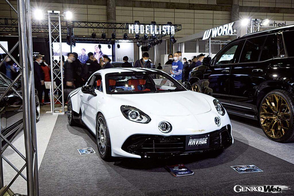 ラリー界の黄金期と言えるグループ4時代のアルピーヌA110を現行型で再解釈したのがラヴァージュ・グループ4だ。カーボンボディカウルによって110mmも拡張されたワイドボディを持ち、ECU&吸排気の再構築により最高出力330PS、最大トルク38.7kgmを発揮する。足まわりはKW V3、ホイールはOZレーシング製となる。ラヴァージュブランドはここ日本で畑野自動車と提携しており、今回は日仏のハンドクラフト精神の融合をアピールしていた。
