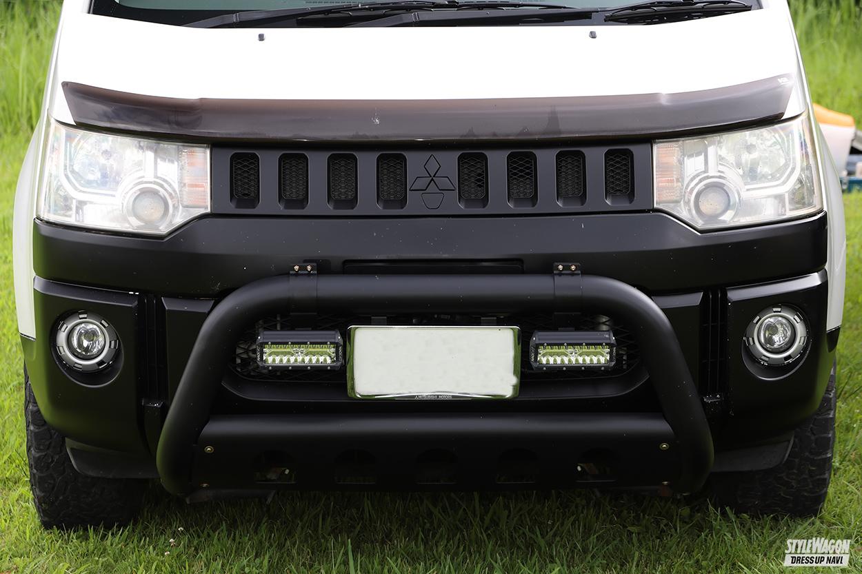 「街乗りと言うより、林道とかで遊ぶのがメイン」と話すオーナー。ボンネット上についたバーライトも林道を走るためで、ヘッドライトにつくガードも伊達ではない! とはいえ、このデリカが初めてのオフ車だそうで、タイヤの選択は少し迷った様子。MTまでは……、でもオフも走りたい……。そこでRTを選択。この日は関西から自走してきたが不満なし、選択は大正解だったみたいですよ!!