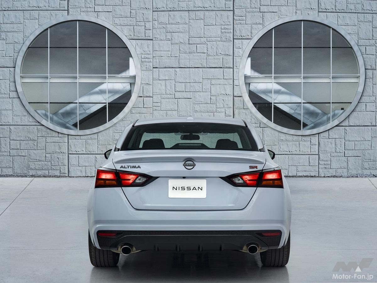 2023年型「アルティマ」の注目点は、やはりフロントフェイスだろう。日産のVモーショングリルの表現を刷新し、独特のスポーティなデザインを実現するとともに、新デザインのブランドロゴが装着された。「SR」グレードには、「ブラッククローム」仕上げの専用グリルが採用され、他グレードとの差別化が図られている。新しいフロントマスクには標準装備となったLEDヘッドライト、リアには大型のテールライトが用意され、ボディ上部のシングルパネルムーンルーフなどがエクステリアの主要な要素となっている。