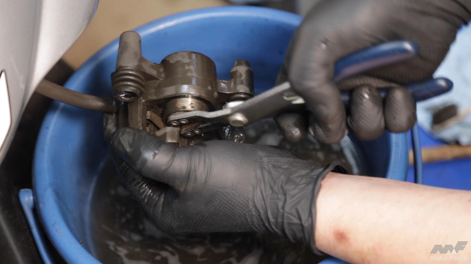 熱湯につけて、歯ブラシでしっかり汚れを落とします。キャリパーピストンツールを使って、ピストンの全周を綺麗にしている点にも注目です!
