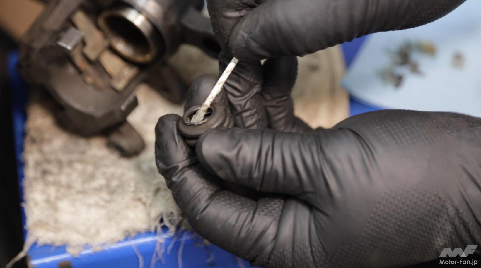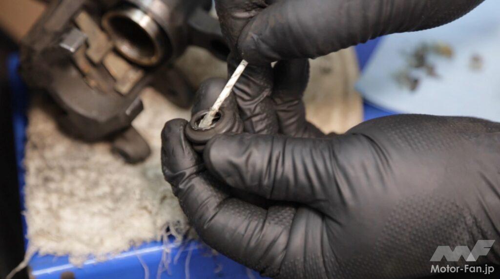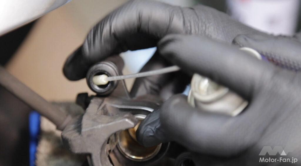 次はダストシールの汚れを『もみ出し」という方法を使って除去。さらにブレーキオイル(フルード)を使ってピストンの潤滑性もアップさせます。