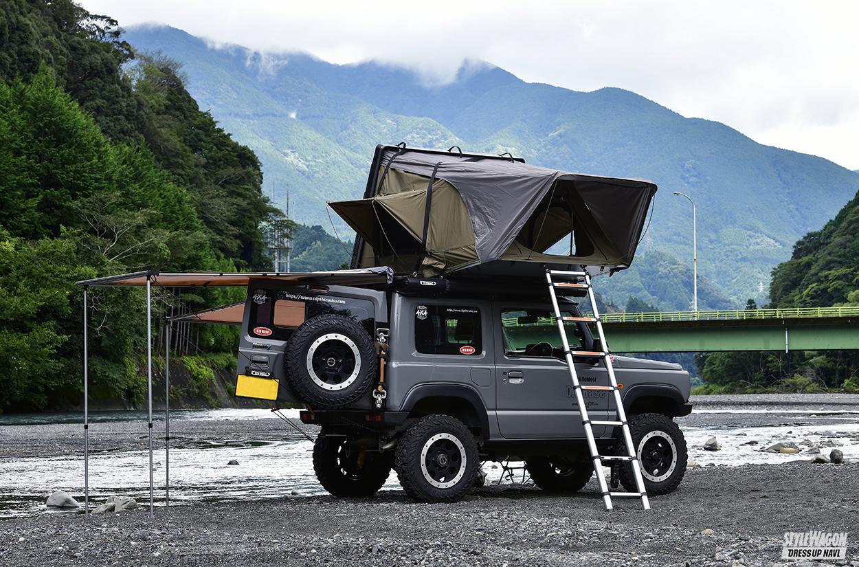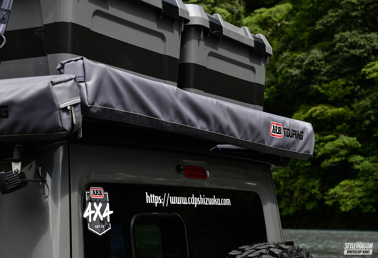 静岡県のOGベースは、ジムニーで数々のトライアルレースに参戦してきた小倉代表が営む、CDPシズオカを母体とするオリジナルブランド。ゆえに走れるジムニーの製作実績も豊富だが、アウトドア使いに特化したカスタマイズも得意としている。自社のパーツで固めたデモカーはトライ&エラーを繰り返しながら進化し続けているが、新たに取り付けたのはARB・エスペランスのルーフトップテント。そして側面にはARBのサイドオーニングを装着。これがジムニーでキャンプする上で最高の組み合わせ。