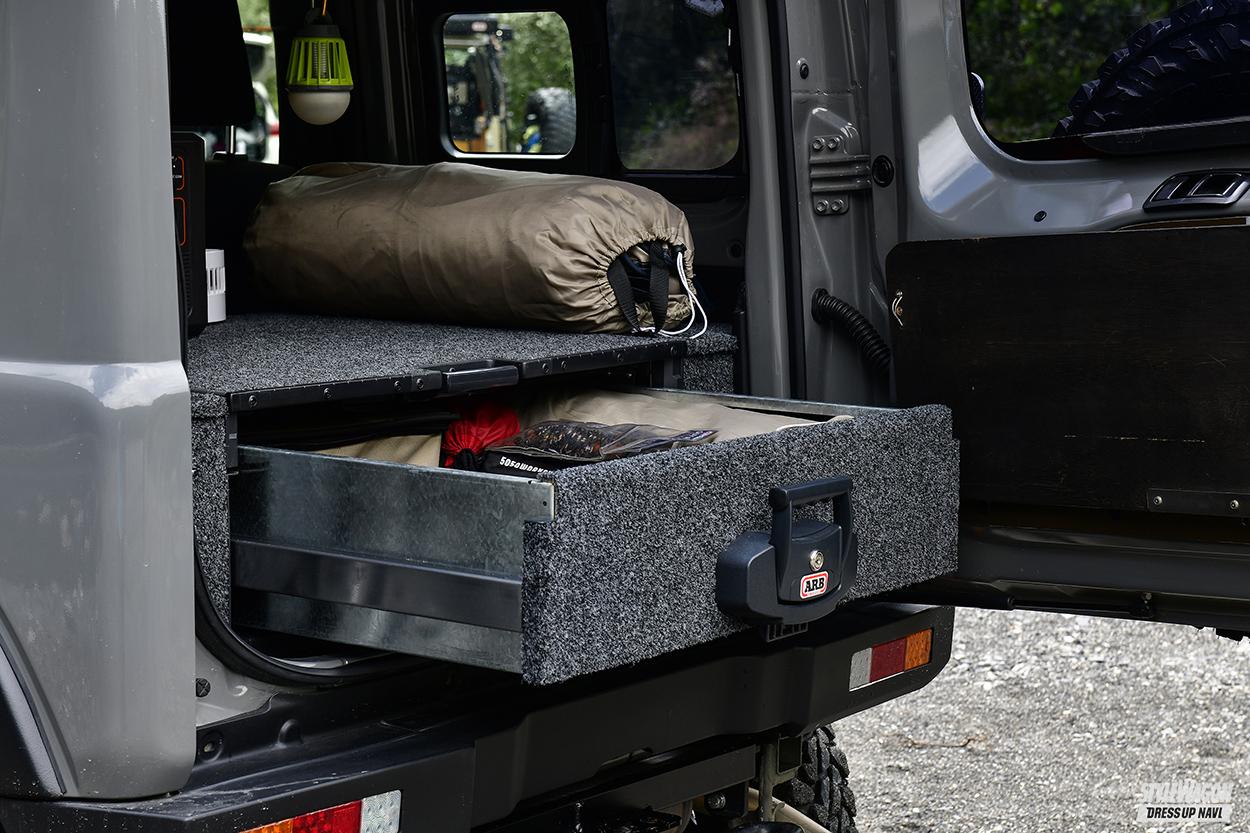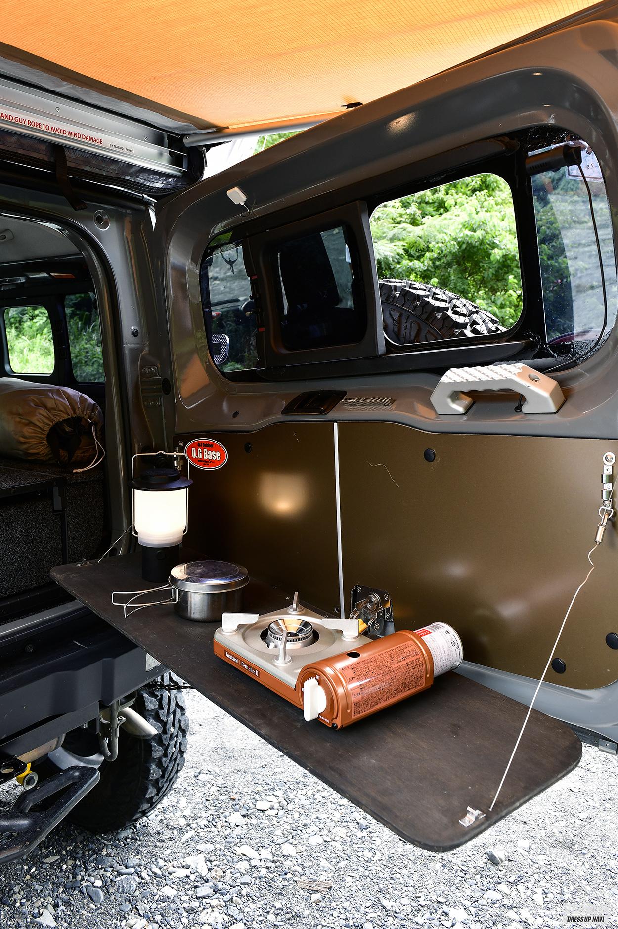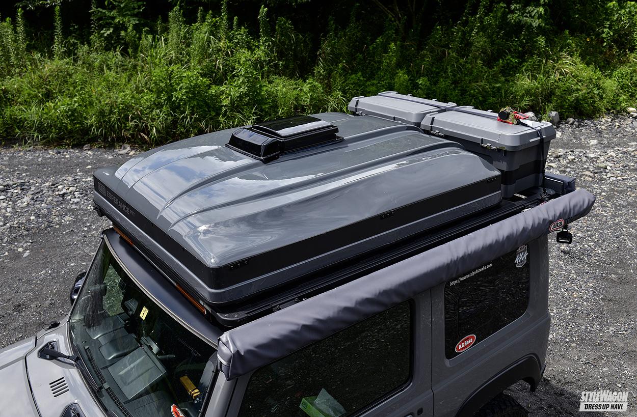 キャンプ向けのアイテムとしてはARBのベースラックに、同社のルーフトップテントを装着。テントは本来ジムニー用ではなかったが、OGベースが研究を重ねてジムニーにも行けることを確認済み。そして上部にファンを付けることでテント内の通気性を高め、快適に過ごせるという工夫も見逃せない。さらに収納ボックスや格納式のテーブルなど便利なアイテムを追加して、利便性を向上した。