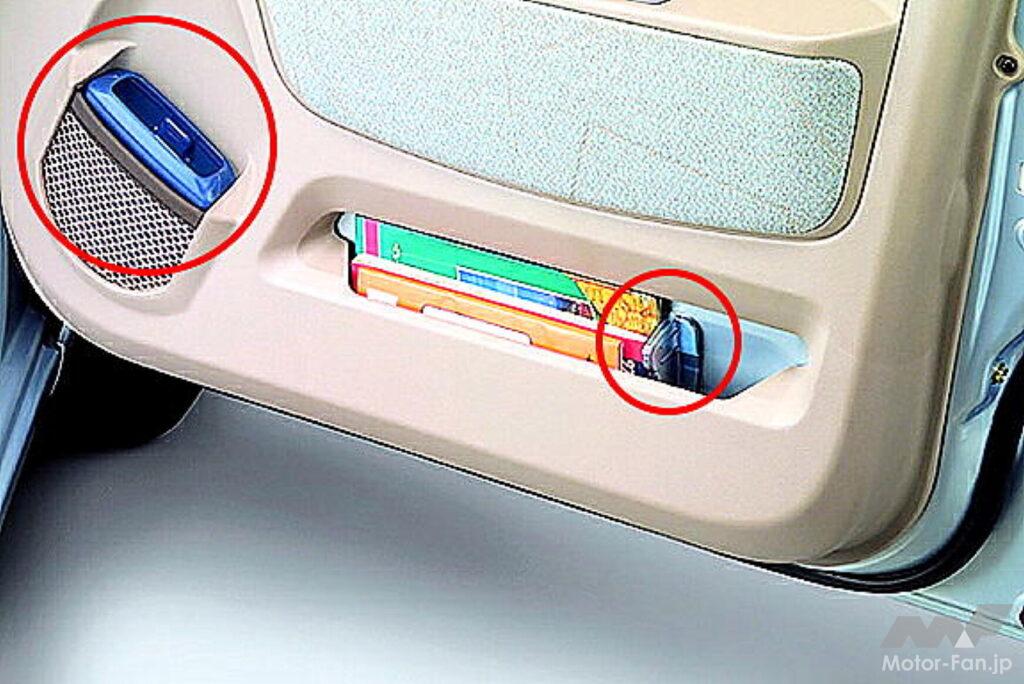 この初代eKワゴンの運転席側、右フロントドアのドアポケットには、従来にない2つの装備がありました。一つは前方のユーティリティポケットに装着された『プチごみ箱』、そしてもう一つは『霜とりクン』と名付けられたスクレーパーです。