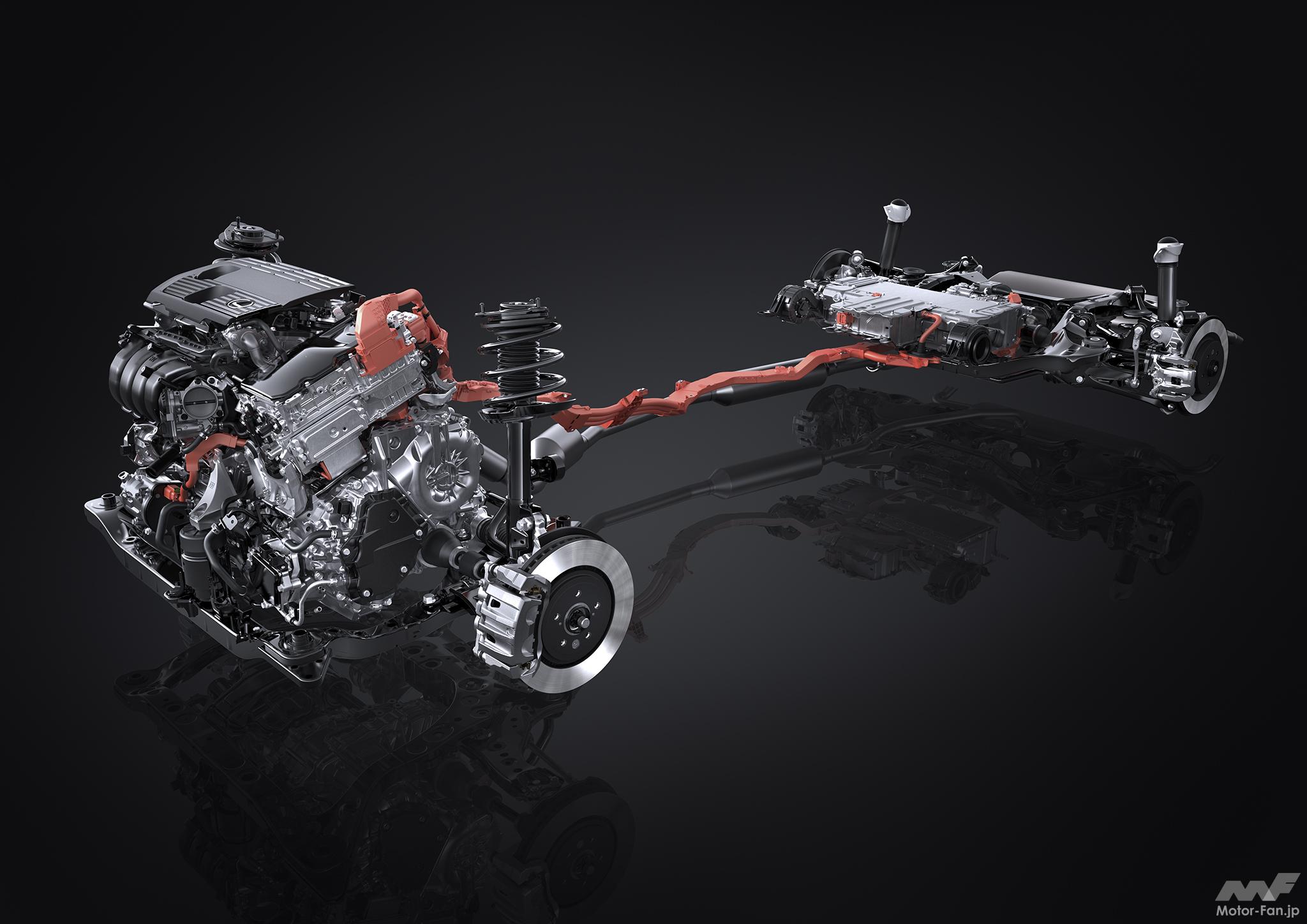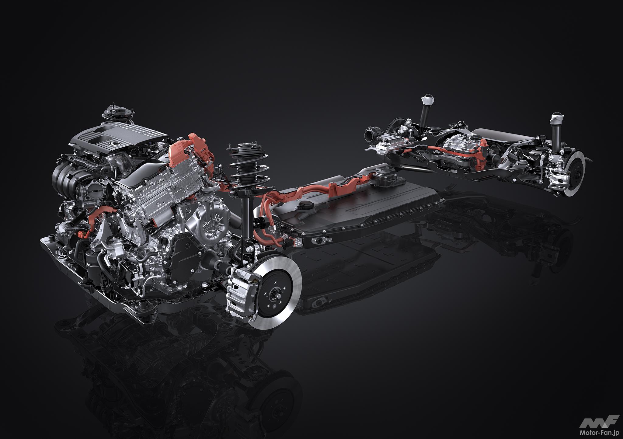 T24A-FTS型は8速ATと組み合わせる「RX350」と、おそらくトップグレードとなる「RX500h」が搭載する。RX500hは、新しい「パラレルHybrid」システムを搭載。エンジンとモーターの間にクラッチを配置。さらにトランスミッションは6速ATで、通常トルクコンバーターが収まる部分にクラッチを入れる新しいシステムだ。モーターとエンジンを完全に切り離すことができるので、エンジンのみ、モーターのみ、混合を自在に使い分けられるシステムのようだ。また、RX500h F SPORT Performanceは、リヤに高出力のモーター「eAxle」を組み合わせたDIRECT4の4WDシステムをとる。