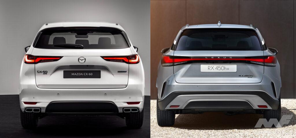 となっている。全長はレクサスRXの方が150mm長いが、ホイールベースは20mm、CX-60の方が長い。