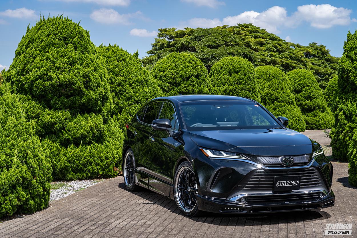 ボディボトムの安定感を高めつつ、見た目のスポーティさを高めるブレス。SUV特有の腰高感をやわらげながら、都心映えする躍動感のあるフォルムを念頭に仕上げた。スタイリングの核となるフロントはLEDの有無で2タイプから選べ、対となるリアは純正マフラーのままでも違和感なく決まるようデザイン。両者の橋渡しとなるサイドはパネルタイプでボリューム感をアップと、全方位を的確に攻略できる。それらベースエアロの引き立て役となるアクセサリーはすべて貼りモノで、素材感でハリアーを鼓舞できるリアルカーボンが、フロントバンパートリムなどで選べる。
