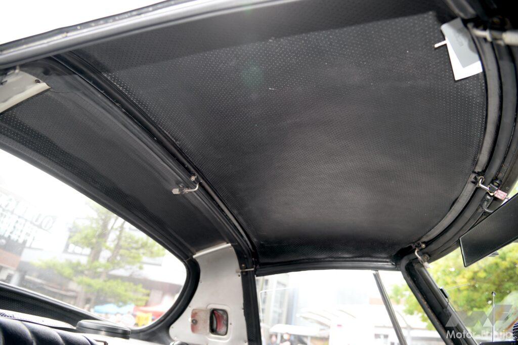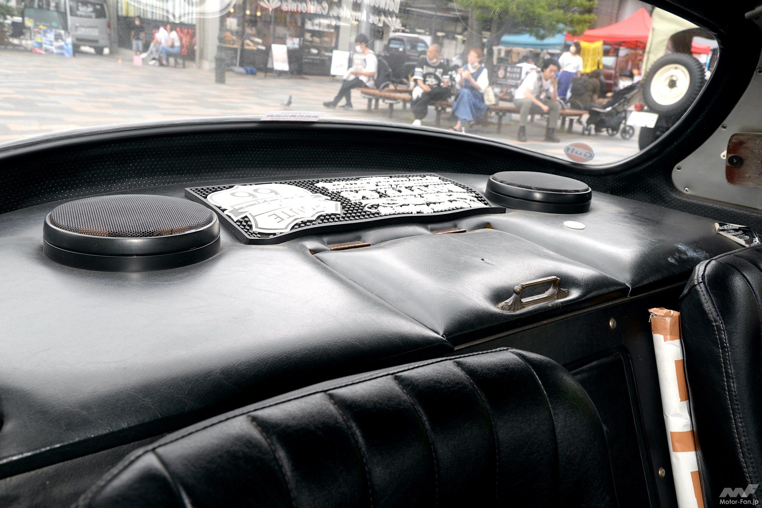 室内を見ると純正を重視するより快適性や楽しみを優先されているとわかる。前述の扇風機などは必需品かもしれないが、シートの後ろには大きなスピーカーが設置されていた。ダッシュボードにはCDプレーヤーも装備されていたので、音楽を楽しめるようにされたのだろう。スピーカーを設置した場所は本来、ファスナーを開閉することでトランクにアクセスできるような構造。スピーカーを支えるような強度は当然ないため、この部分は作り直されているのだろう。スピーカーの間にあるフタのようなものも純正にはない装備だ。