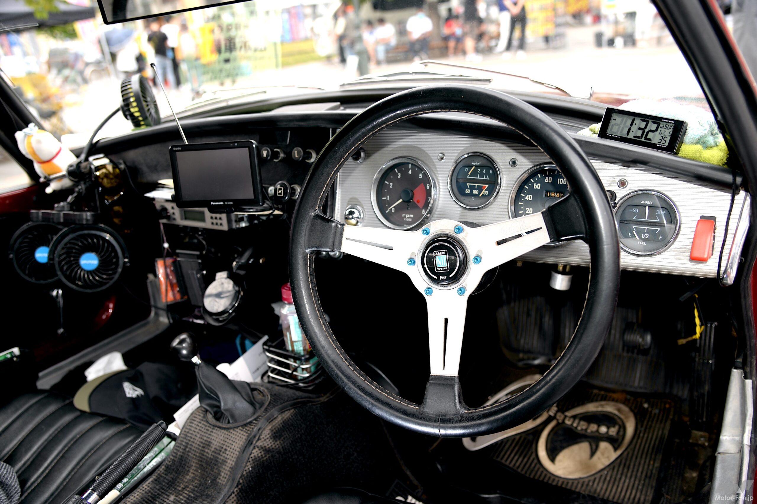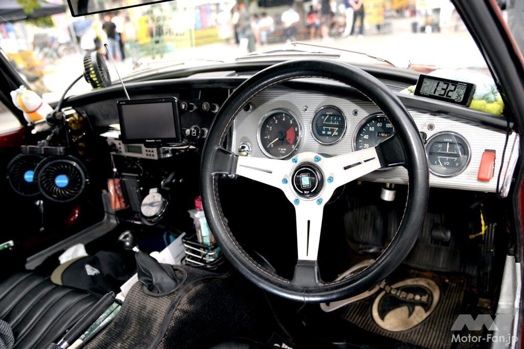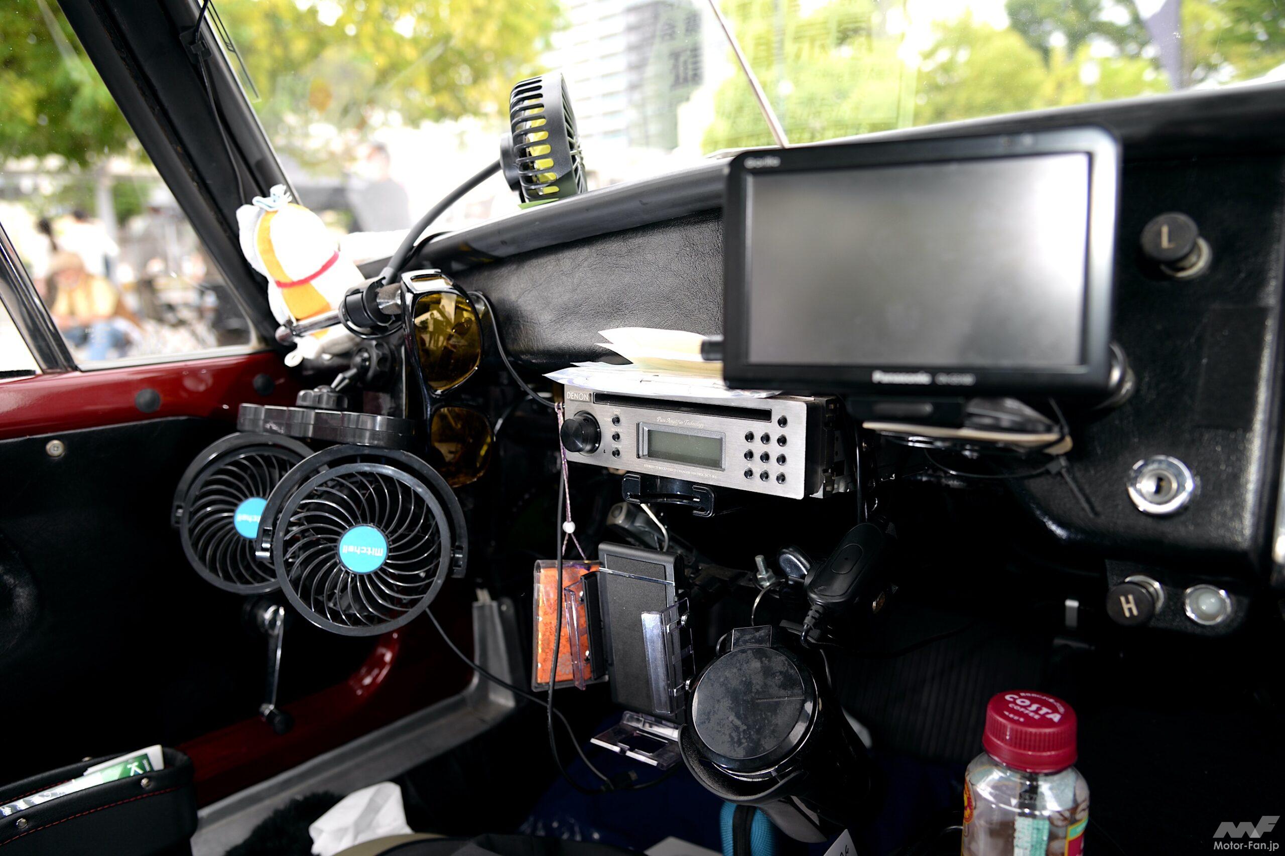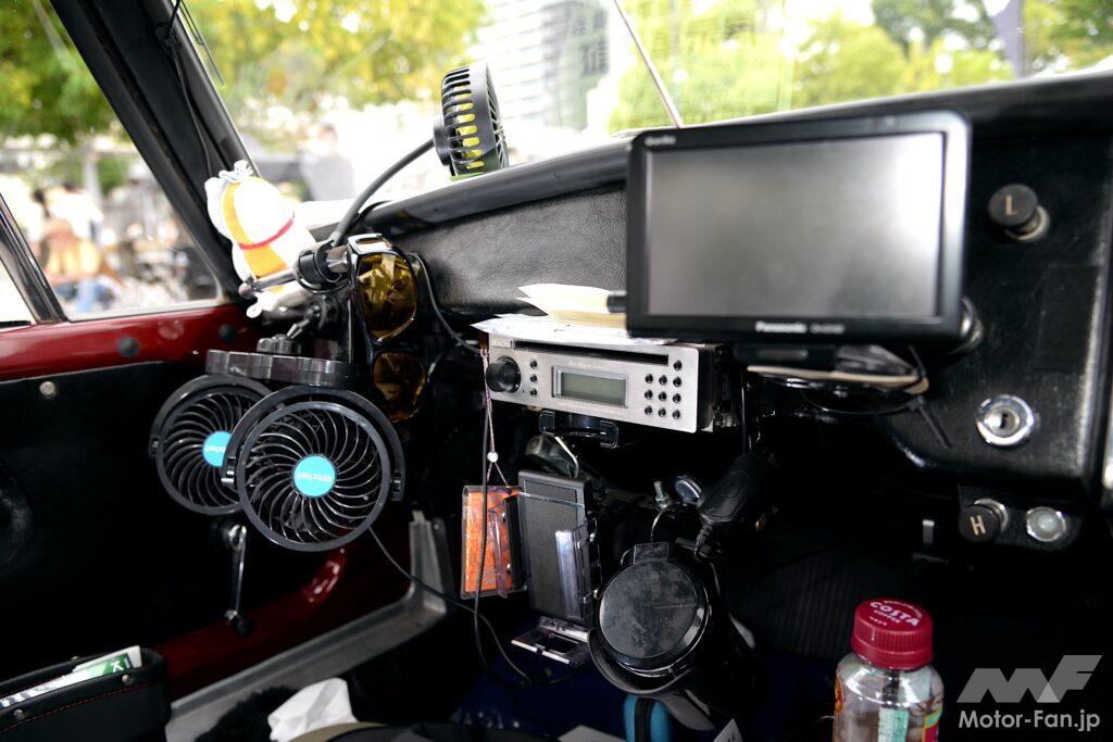 実用性ではなく楽しみのために所有している旧車とはいえ、イベントへ自走して参加するならエンジンやミッション、足回りに不安があってはままならない。長谷川さんのように一気にオーバーホールできれば理想的だが、徐々に進める人も多いことだろう。旧車イベントに参加されているオーナーたち、特に希少な国産車はこのような苦労を乗り越えた人ばかりなのだ。今回のイベントは6月の開催だから猛暑ではない。けれどエアコンやクーラーのないモデルだと室内には扇風機が常備されていることが多い。長谷川さんのヨタハチにも扇風機が2個装備され、さらにフロントウインドーへ向けてサーキュレーターのようなファンまで追加されていた。