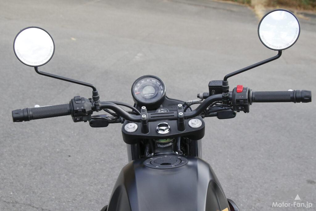 全体的にブラックアウトされたハンドルまわり。アップタイプのパイプバーハンドルがオーソドックスな手法で取り付けられている。