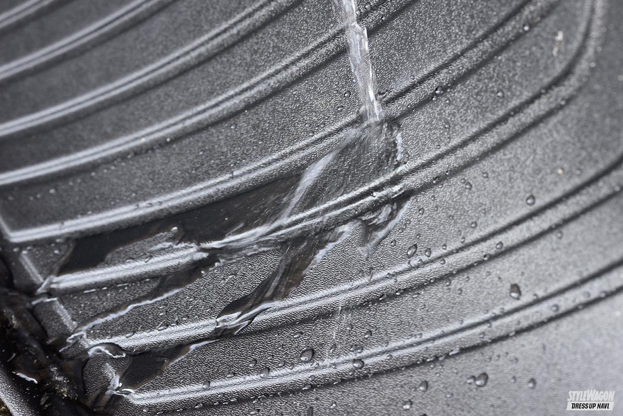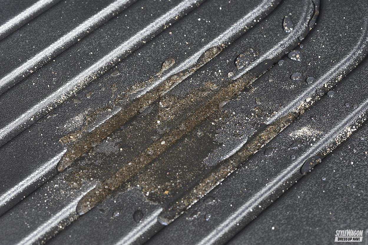 フチが高くマット表面も立体的なデザインなので、砂利や泥などの細かな汚れを逃さずにキャッチ。汚れたら水でキレイに洗い流せる。フロア形状にピッタリとフィットして、マット自体のズレも防止。