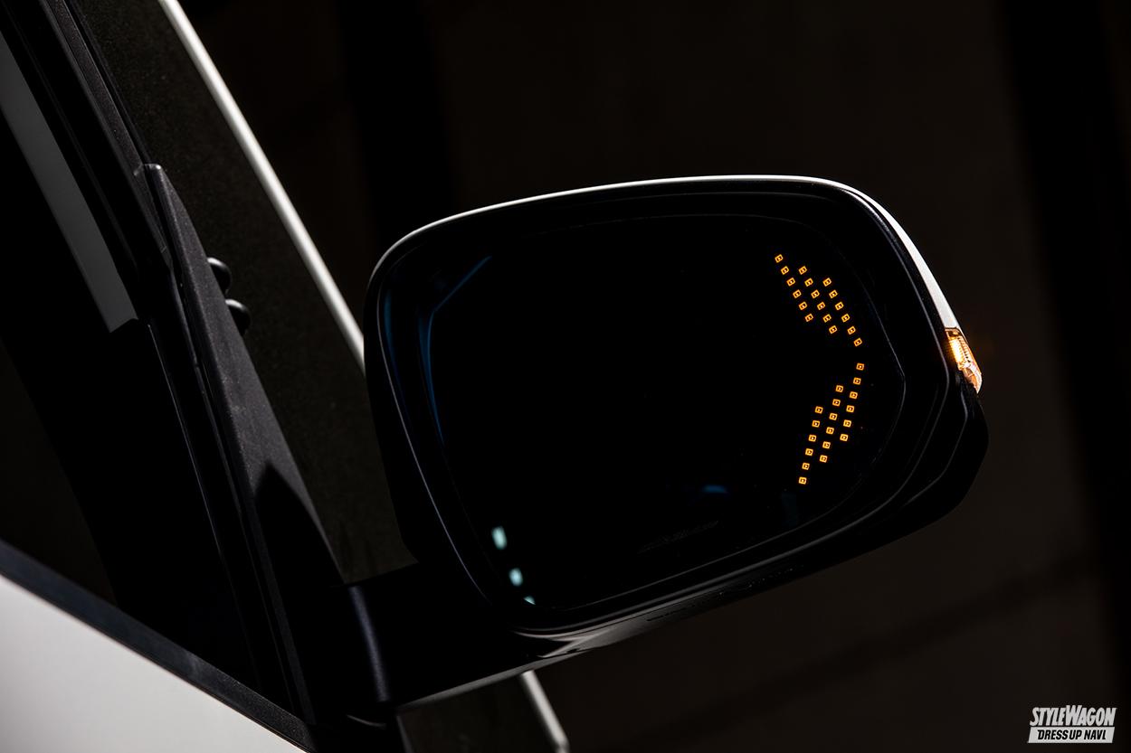 ウインカー連動で点灯するLEDを内蔵した、視認性抜群のブルーミラー。LEDはシーケンシャルと点滅の4つの点灯パターンを切り替えできる。