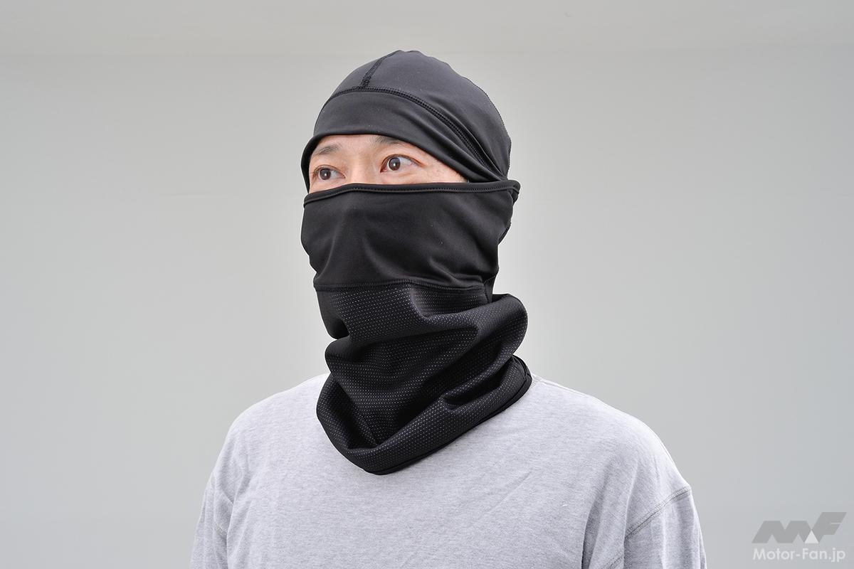 頭部はキャップタイプなので、ヘルメットを被った時にずれにくく、ヘルメットの汚れ防止にもなるのがポイント。首元以外にも、口