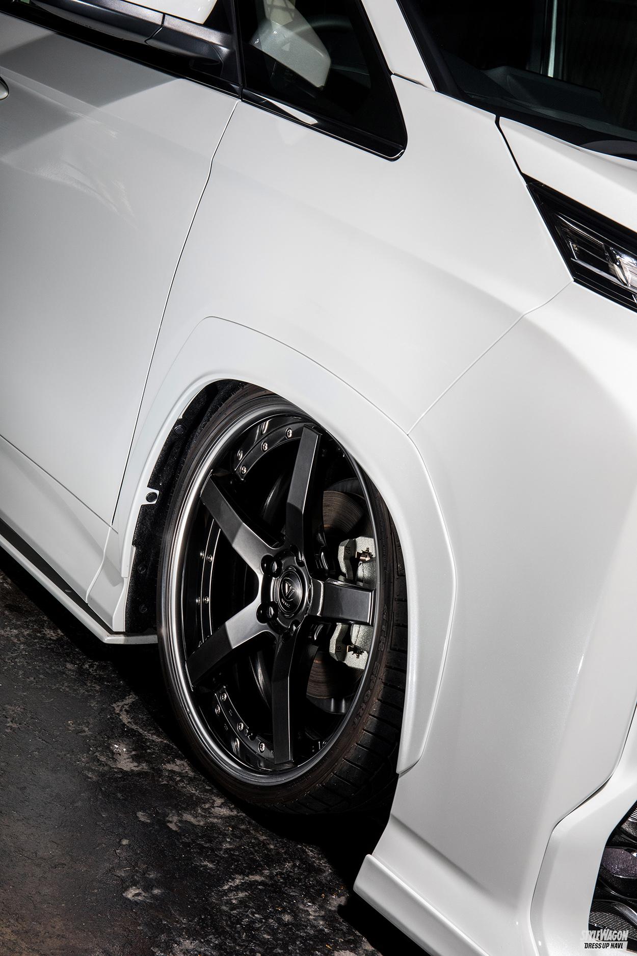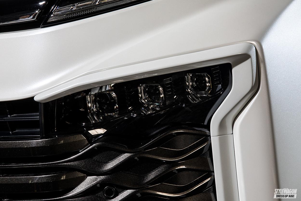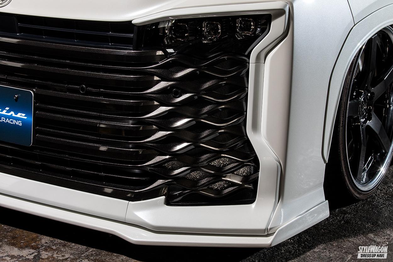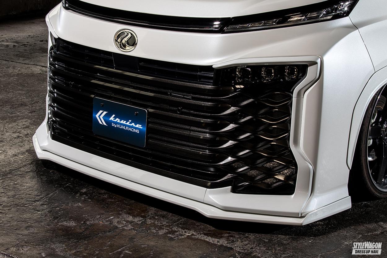 もうひとつ注目しておくべきなのが、まずはヴォクシー用がリリースされたレーシングフォルムカバーのフロントバンパーパネル。バンパーとヘッドライト周囲の純正メッキをボディ同色とし、目隠しできるのがその特徴で、90系ヴォクシーはグリル部が大きくメッキの存在感が強いだけに、これを装着したときのイメチェン度はバツグン。ABSウレタン製だから弾力性があり、両面テープで貼り付けるだけと装着もDIYでOK。片側3分割式だから一部にメッキを残す、もアリ。