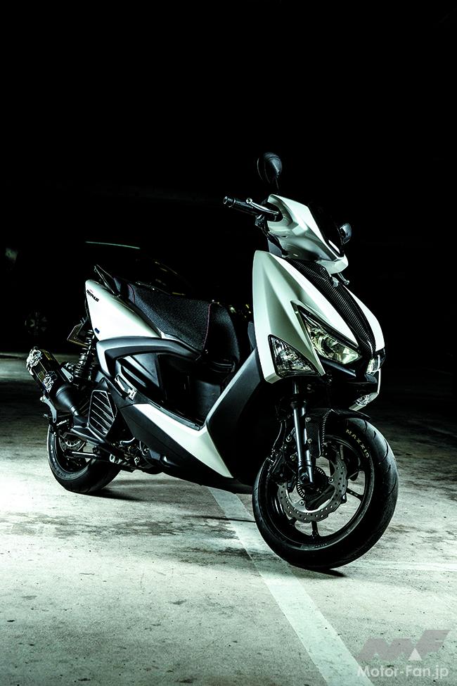 国内販売が待たれる新型のシグナスグリフィスだが、いち早く並行輸入モデルをベースにパーティーアップがライトチューンを実施! カスタムポイントの中でも、注目はNMAX純正ホイールを流用した13インチ化だ。装着は基本ポン付けで、フロントの速度センサーのみワッシャを使ってオフセット。速度計の誤差は実測値に近づく程度で、センタースタンドも不具合なく使用できる。