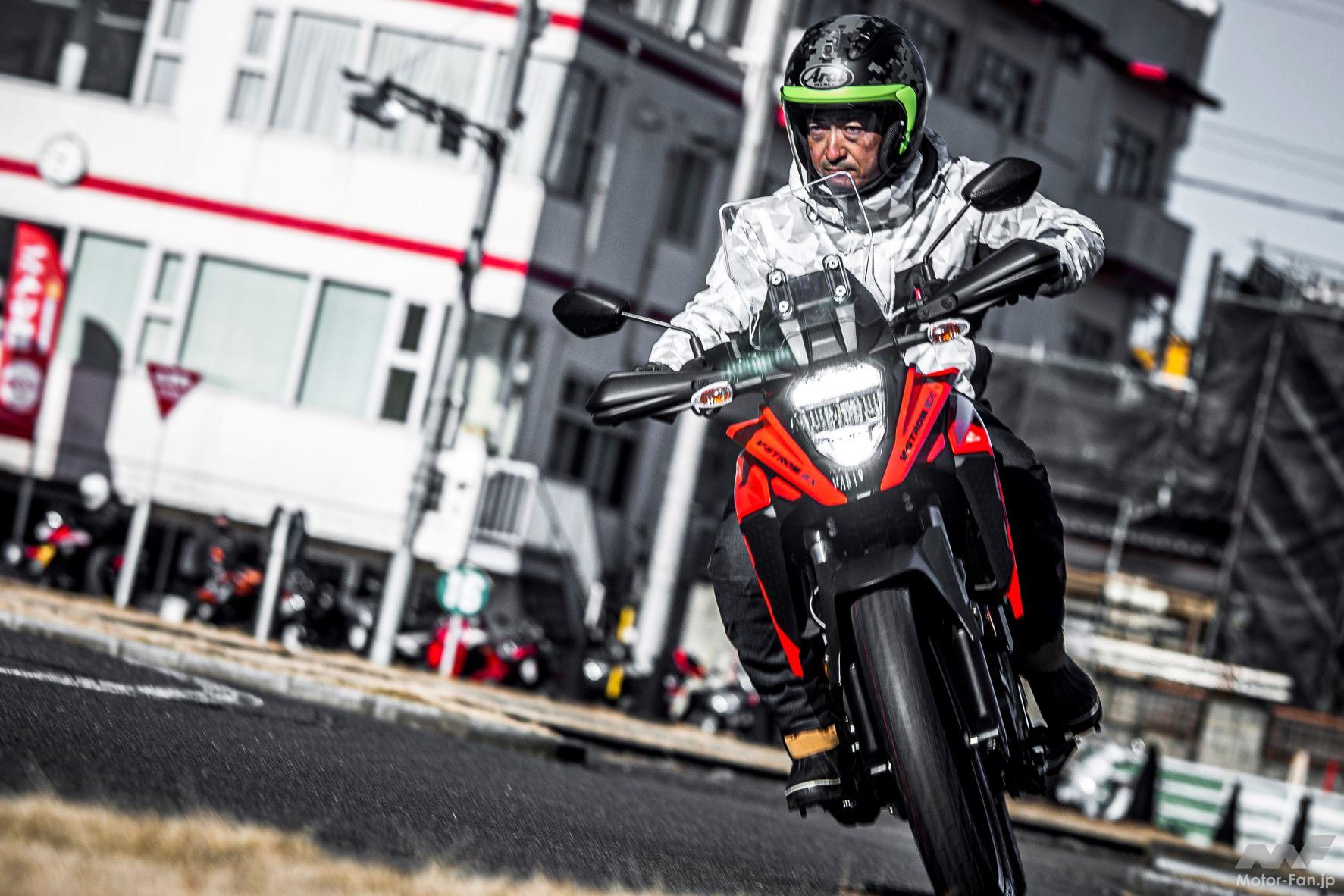 スタートしてすぐに感じるのは、この油冷シングル、こんなにも張りのあるいいレスポンスを持っていたのかということ。ジクサーとは2次減速比が異なる可能性があるが(異なるとすればローギヤード化)、低回転域からの加速が力強いだけでなく、燃焼1発ごとの蹴り出し感が瑞々しいのだ。それでいて、エンジンに急かされるような雰囲気は微塵もなく、スロットルを開けた分以上の悪さは絶対にしない。トラクションコントロールは非採用だが、これだけ制御しやすければ多くのライダーは不満に感じないだろう。
