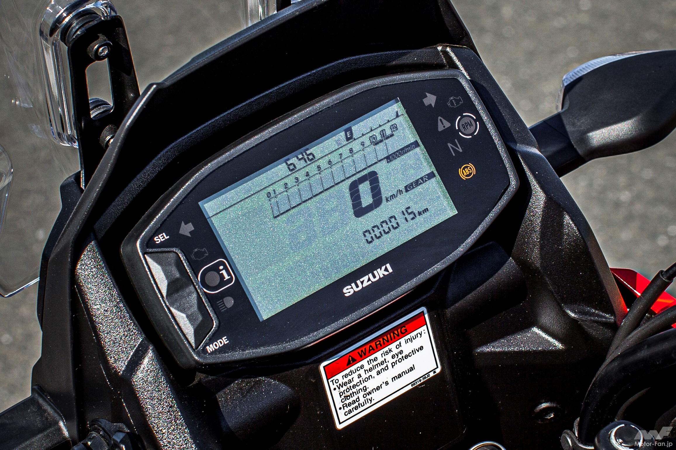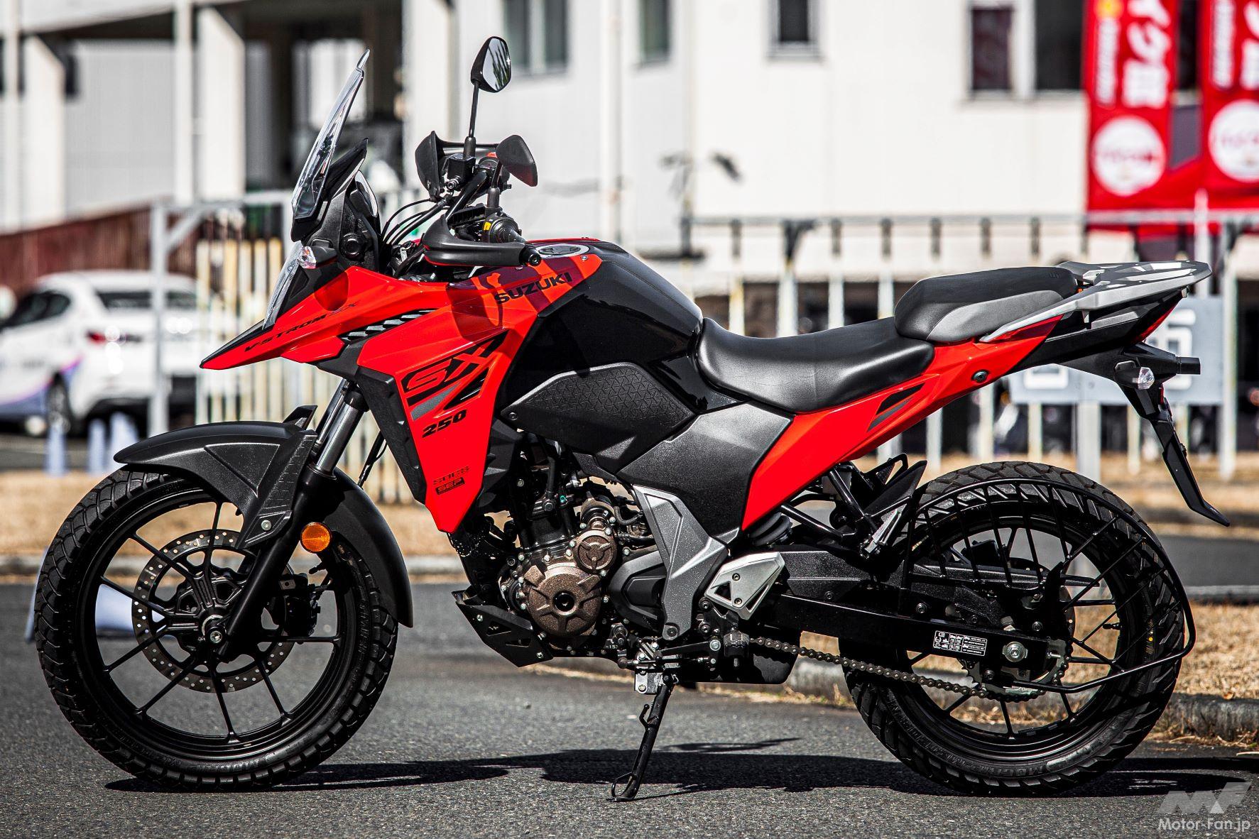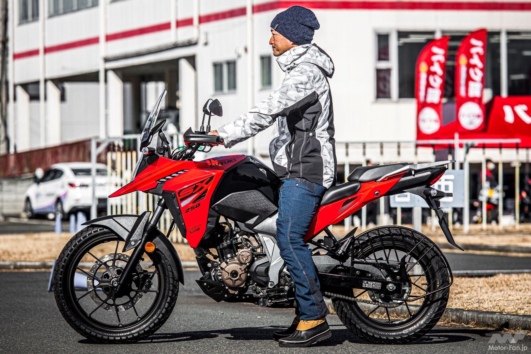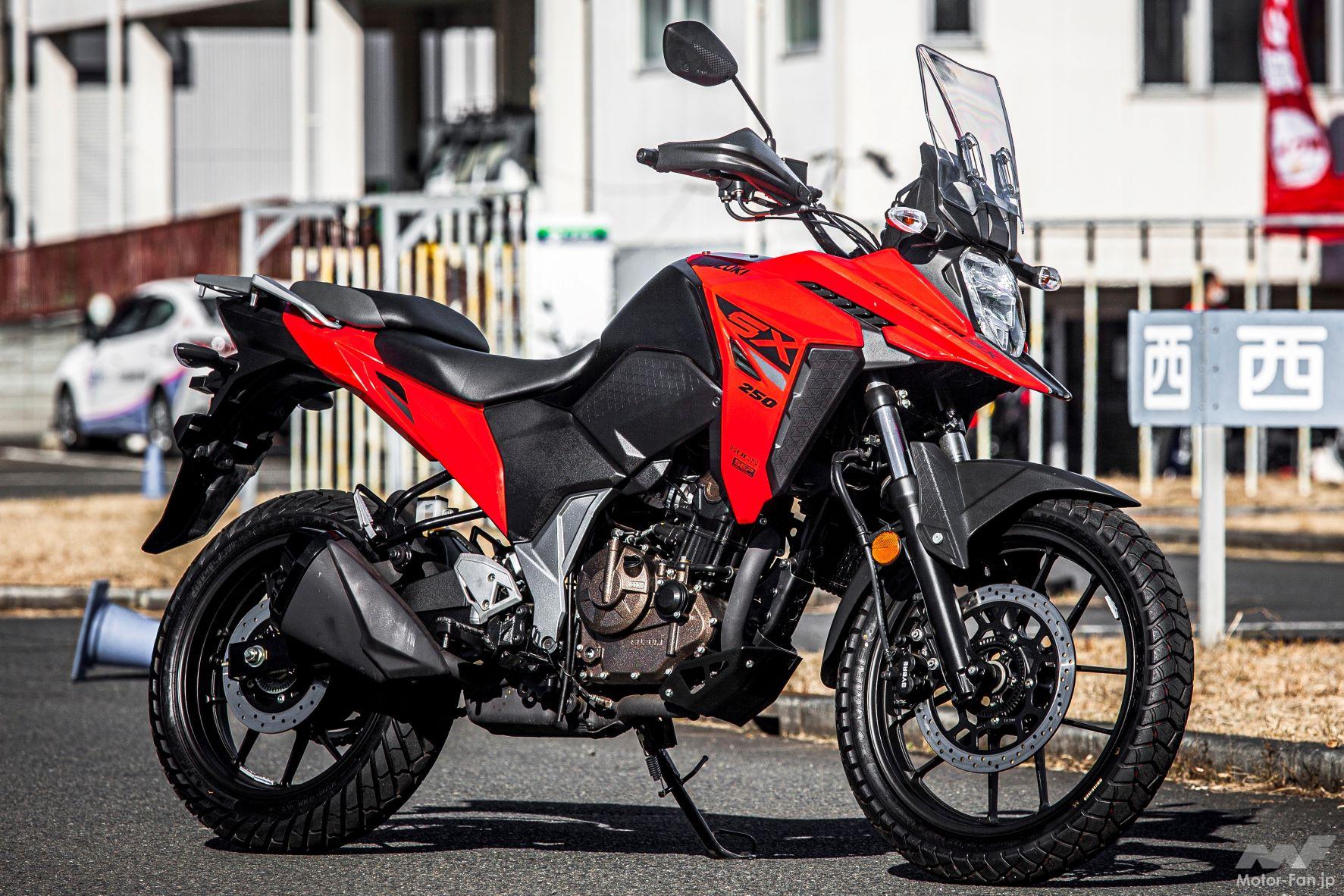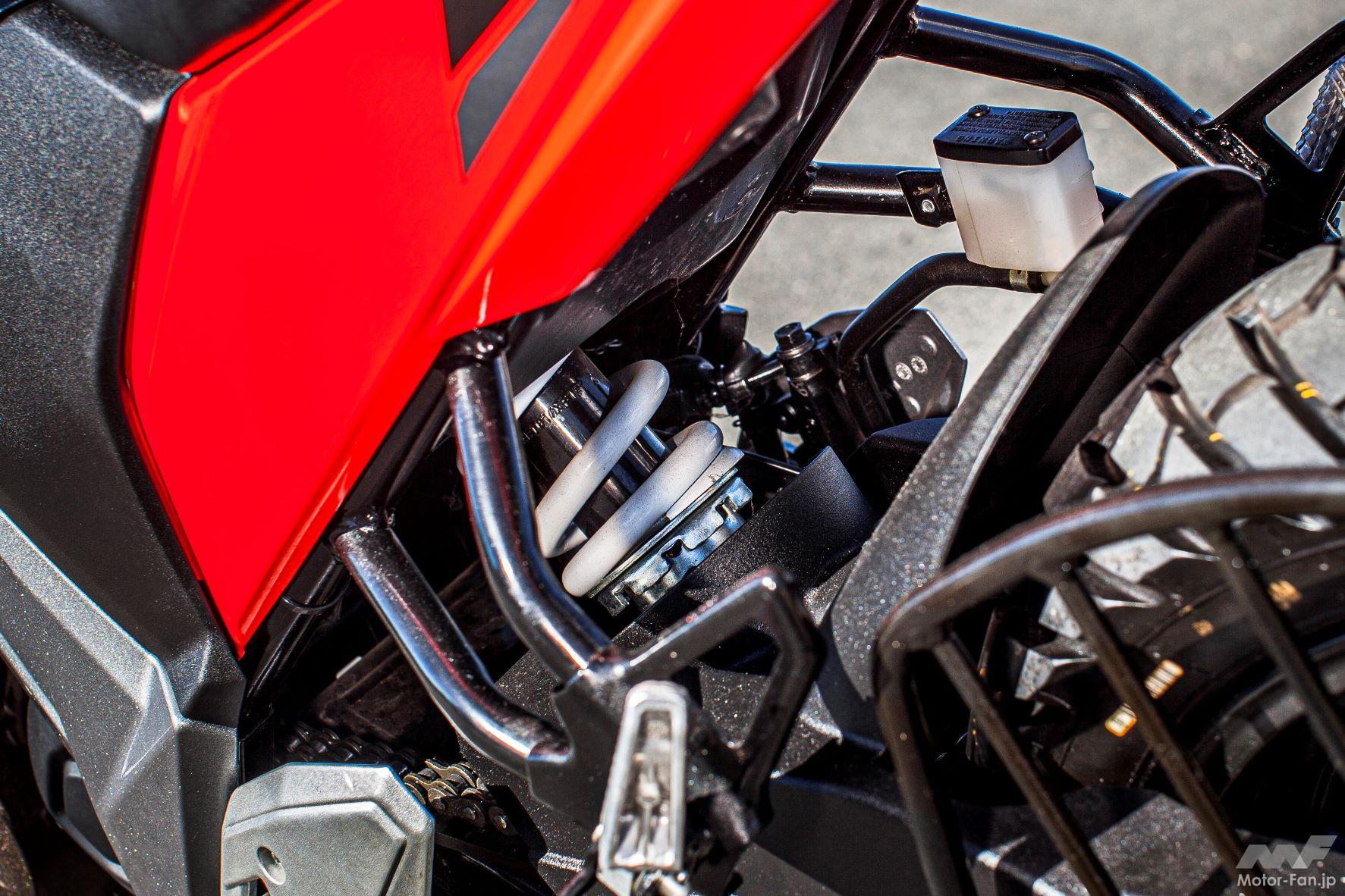 これに対してVストロームSXは、せいぜいメーター読みで70~80km/hまでしか試せなかったが、ベースがジクサーシリーズゆえにコーナーへ進入する際のシャシー剛性感はオンロードモデルそのもの。特にフロントフォークがしっかりしており、あえてジクサーからサスストロークを伸ばさなかったことで、それが顕著になったと言えるだろう。また、リヤショックのバネレートが調整しやすいのも大きな美点だ。