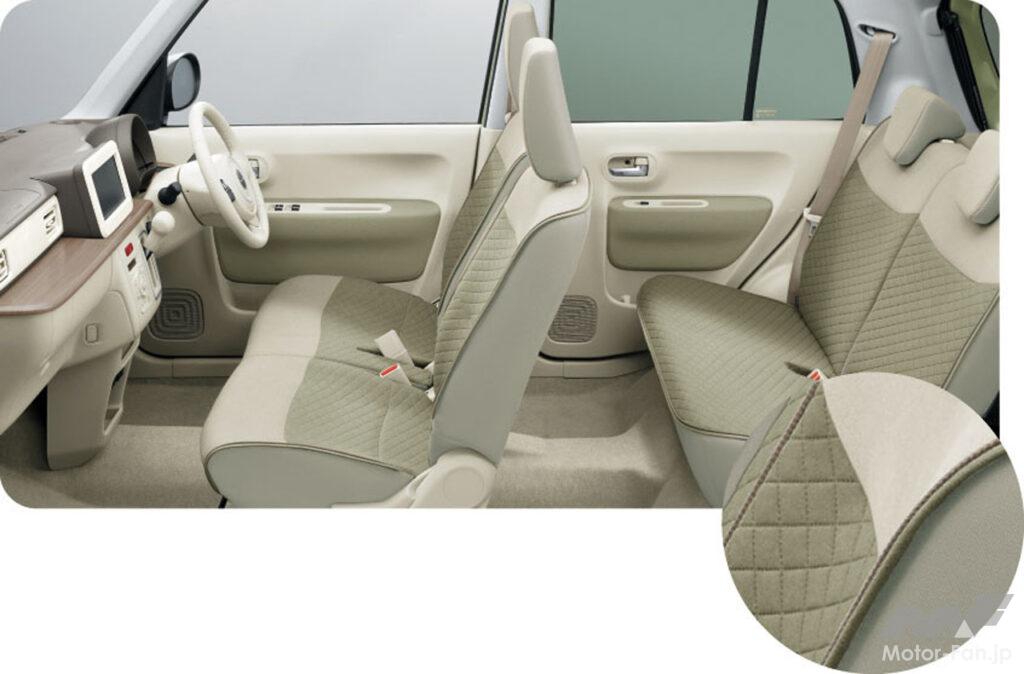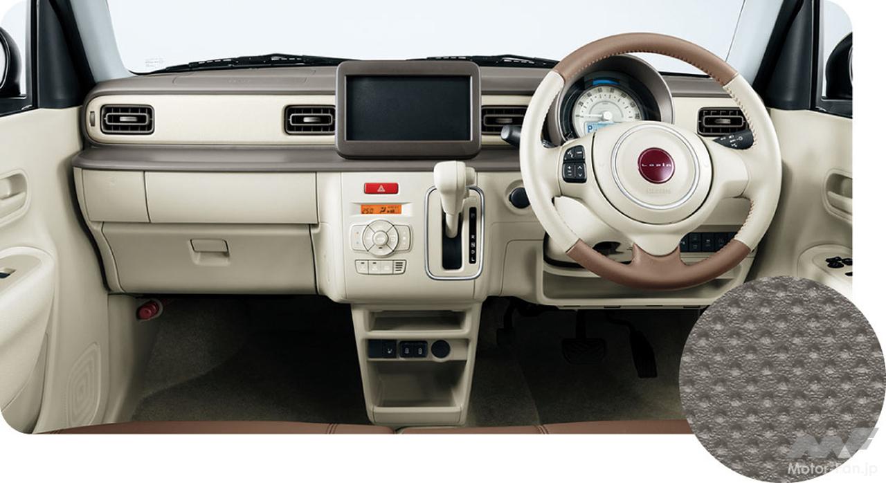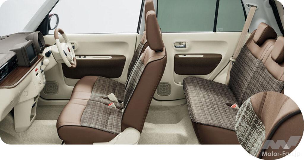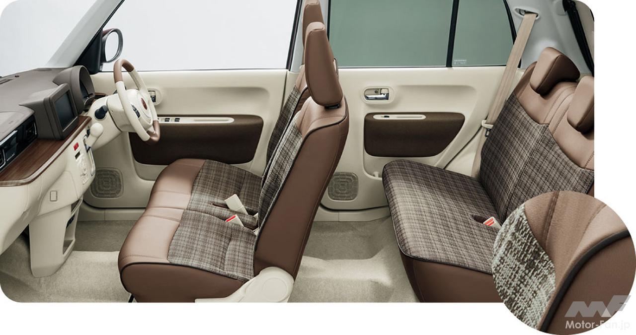 ボディカラーは、新色の「トラッドカーキメタリック」と「テラコッタピンクメタリック」を設定したほか、2トーンルーフ仕様車のルーフ色に「ソフトベージュ」を採用(Xに設定)。インテリアには、Xのシート表皮に「ライトブラウン」と「ライトグリーン」を採用している。