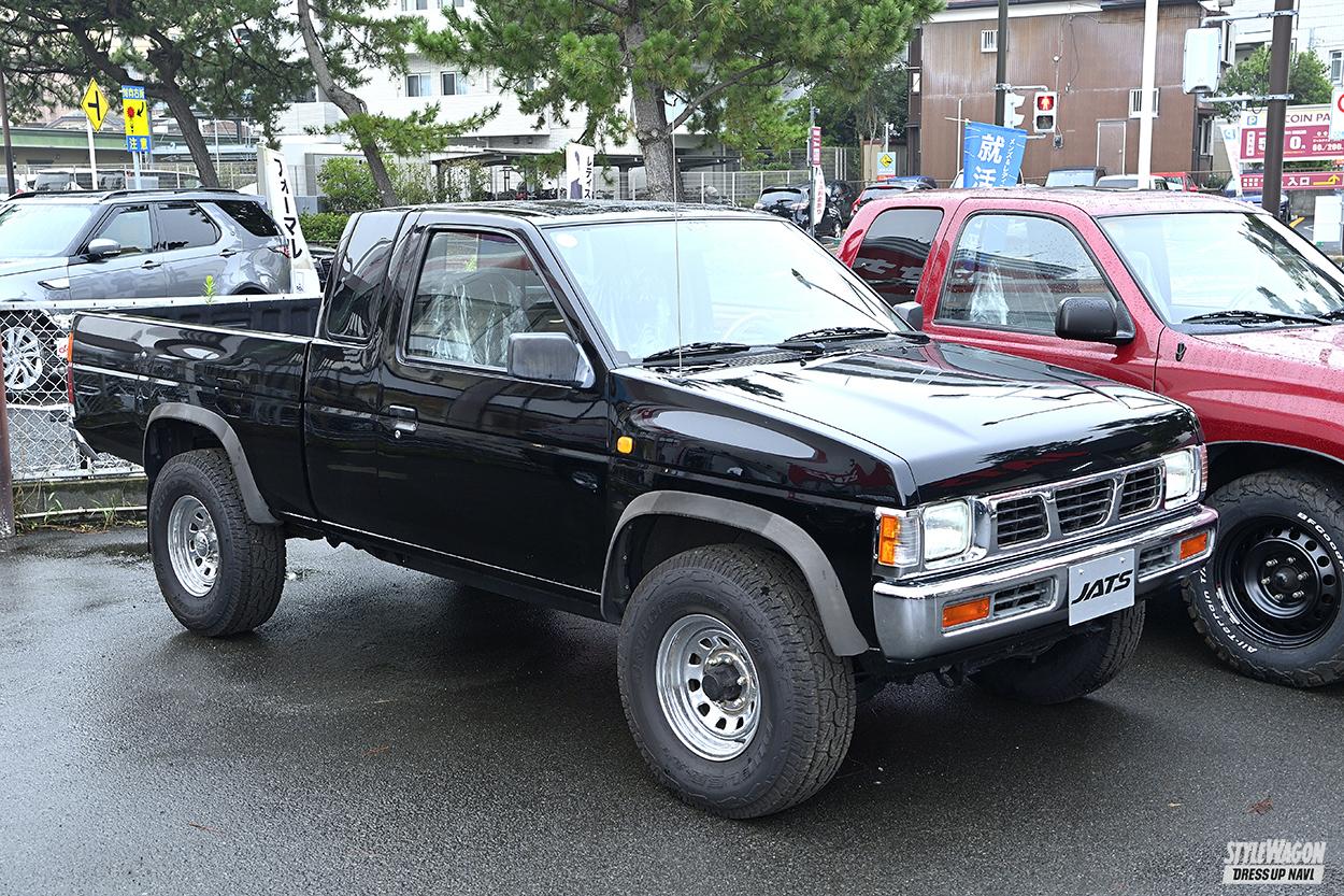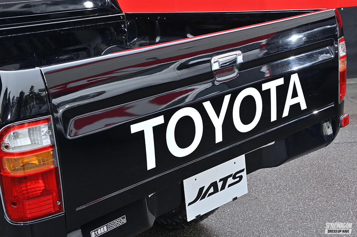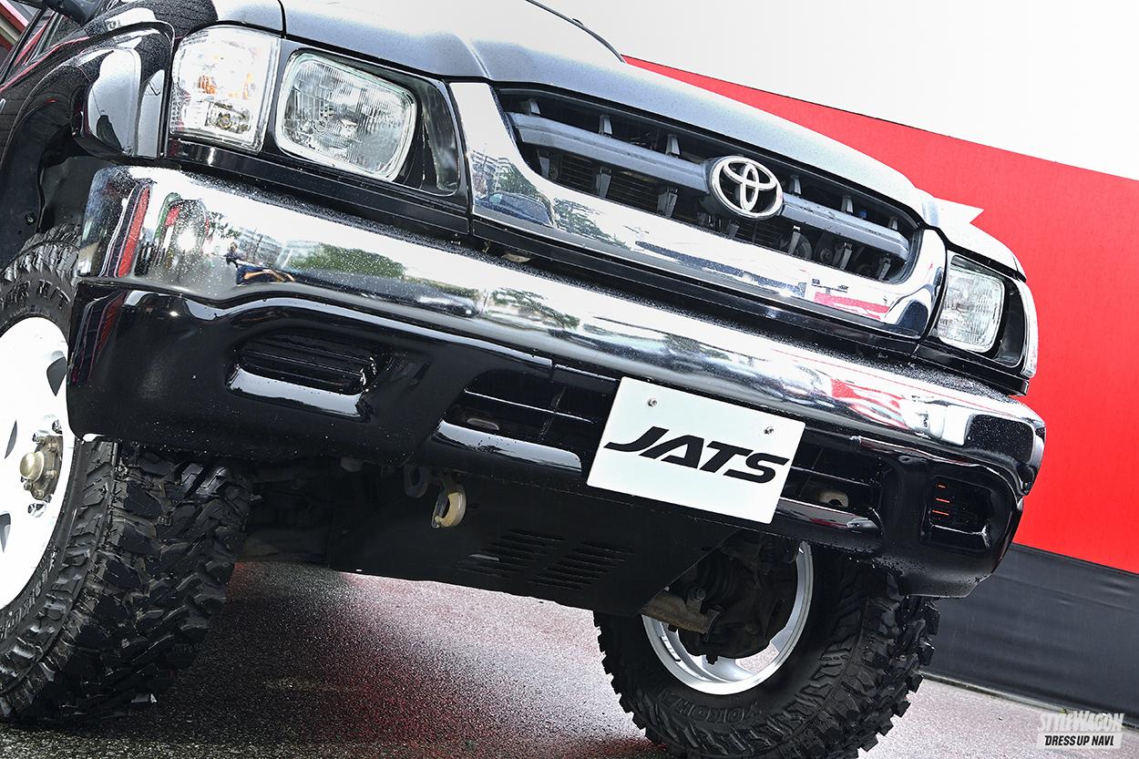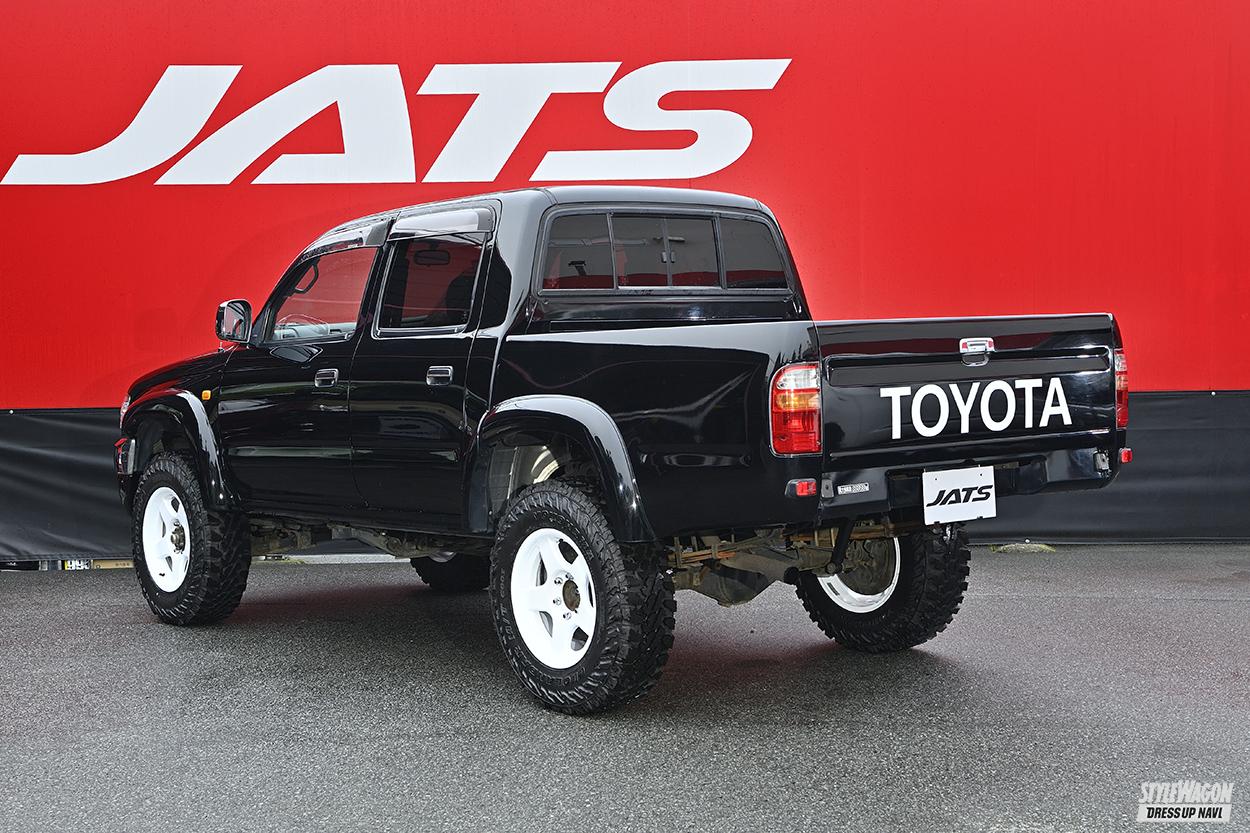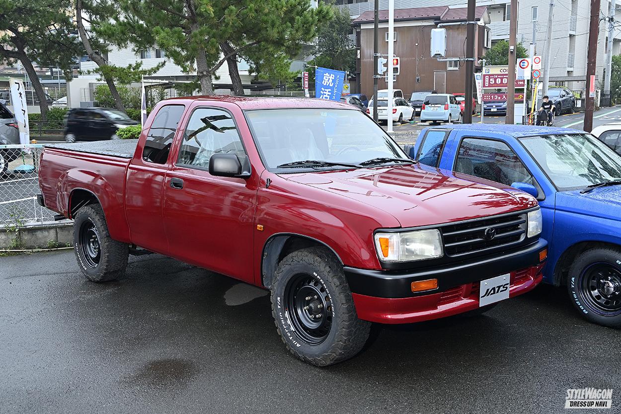 そもそもはハイラックスのカスタム&販売ショップとして老舗的存在であるジャッツ。セミクラ世代のカスタム&メンテナンスノウハウを持ち、最近ではマニアックなピックアップトラックに加え、高年式のUSミニバンやSUVなども扱う幅の広さで多くのファンを抱える。今特集での主役はやはり左のクルマ、ハイラックス。2003年式のRZN169をベースに、白が際立つブラッドレー17インチとワイルドさ強めのジオランダーM/Tをセット。足はノーマルだが、前下がりを解消するためフロントのみトーションバーを調整する。ヘッドライトはジャッツオリジナルのキットで前期型の角目風へとアレンジされ、クラシカルな雰囲気を醸し出す。走行距離は16万キロだが、これだけのカスタムが施されて179万円。お安くないですか?