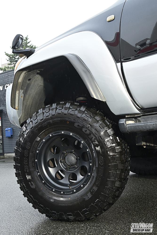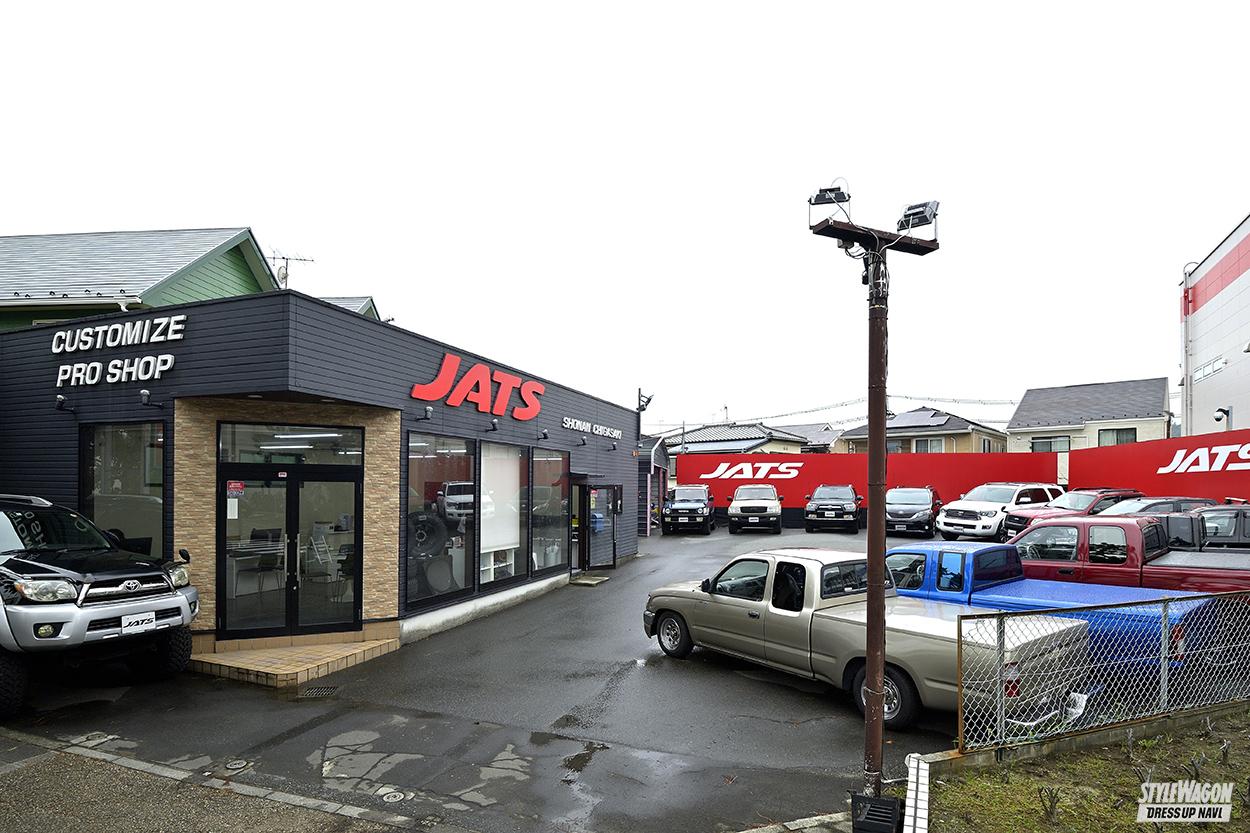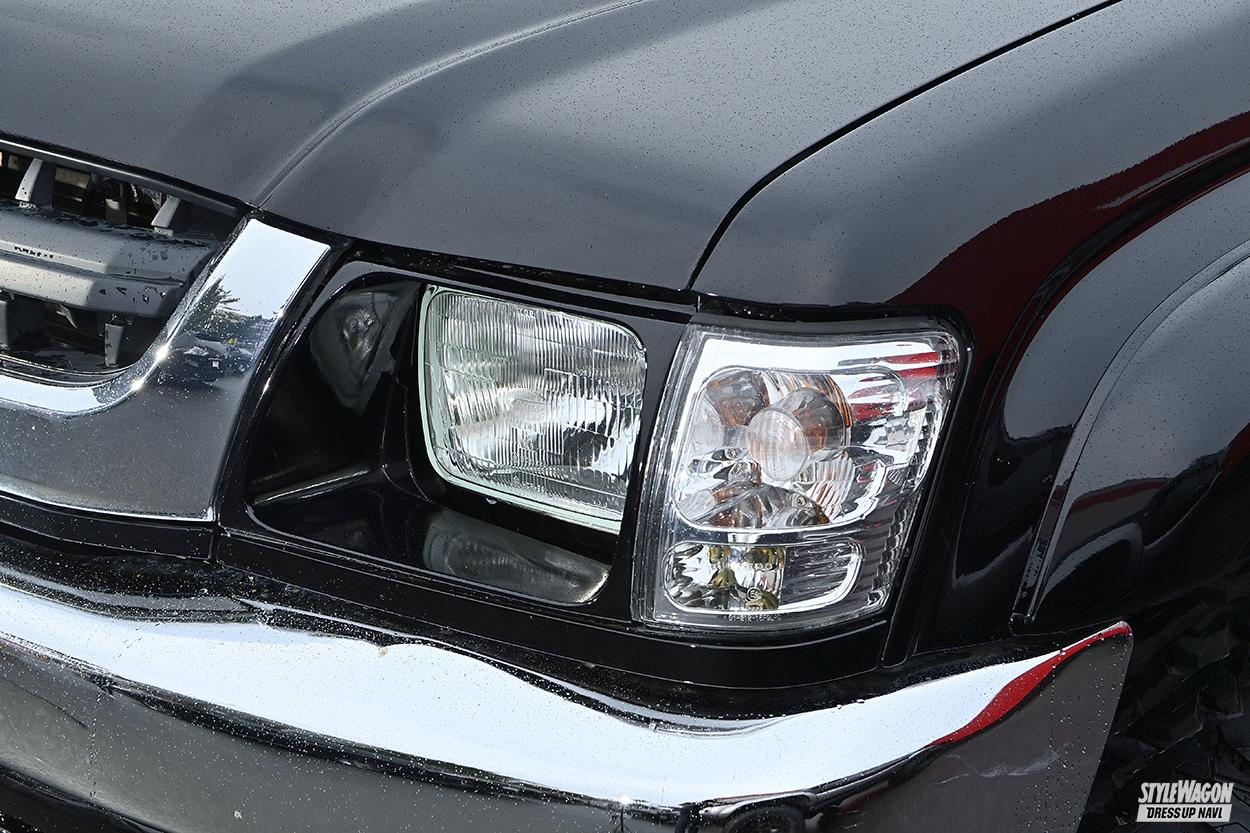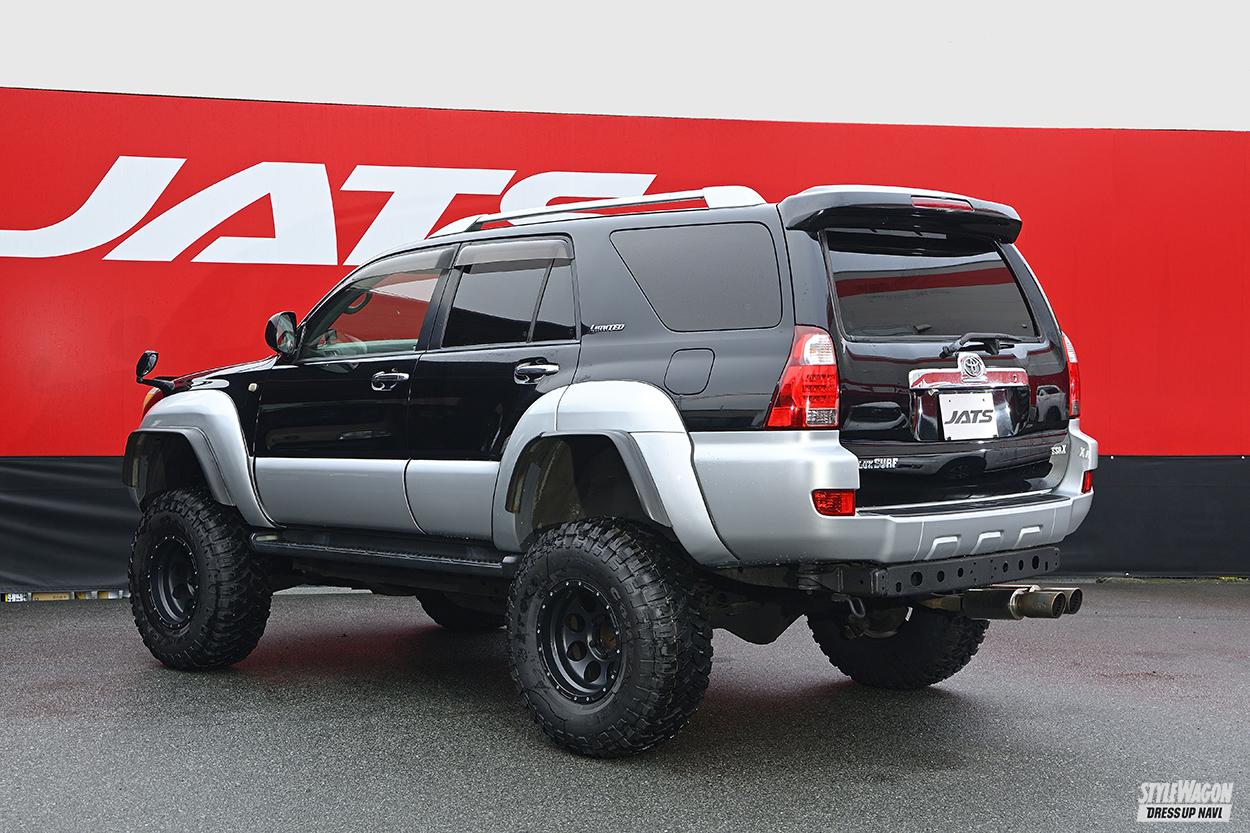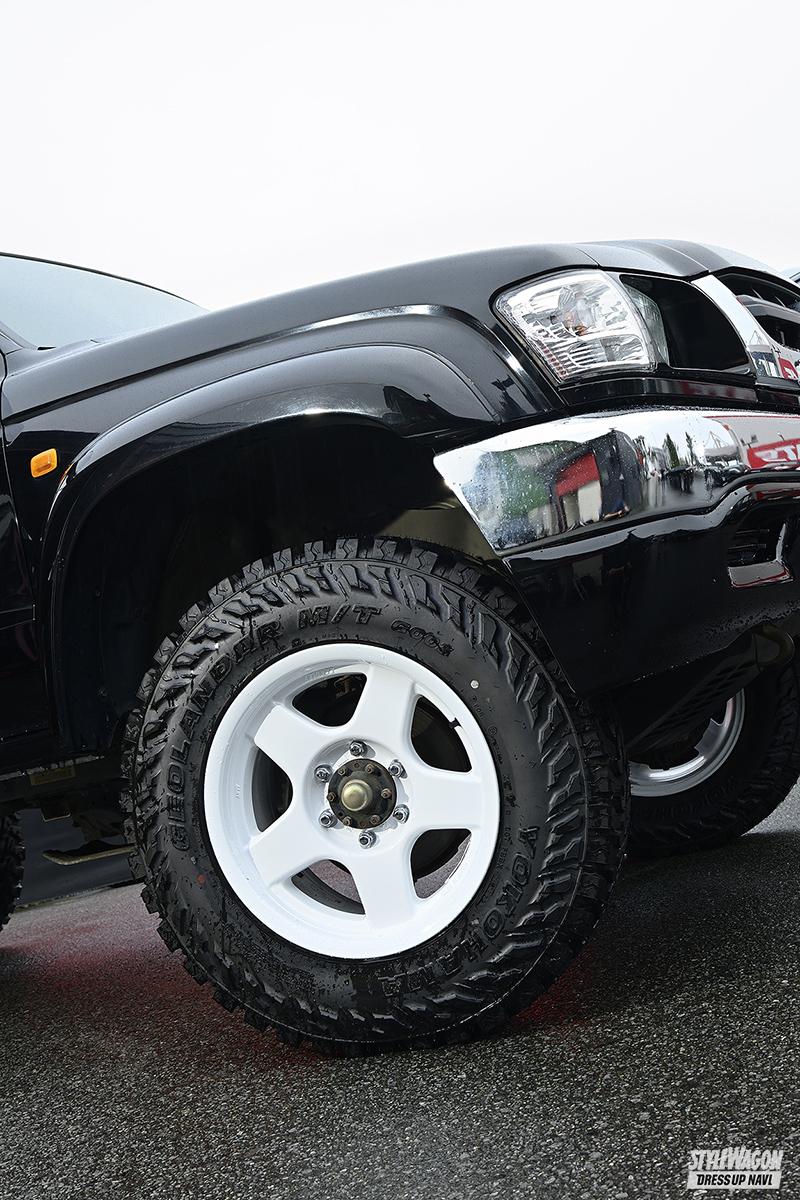 そもそもはハイラックスのカスタム&販売ショップとして老舗的存在であるジャッツ。セミクラ世代のカスタム&メンテナンスノウハウを持ち、最近ではマニアックなピックアップトラックに加え、高年式のUSミニバンやSUVなども扱う幅の広さで多くのファンを抱える。今特集での主役はやはり左のクルマ、ハイラックス。2003年式のRZN169をベースに、白が際立つブラッドレー17インチとワイルドさ強めのジオランダーM/Tをセット。足はノーマルだが、前下がりを解消するためフロントのみトーションバーを調整する。ヘッドライトはジャッツオリジナルのキットで前期型の角目風へとアレンジされ、クラシカルな雰囲気を醸し出す。走行距離は16万キロだが、これだけのカスタムが施されて179万円。お安くないですか?