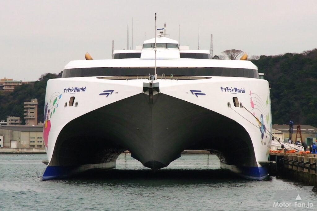 ウェーブピアサーは「波浪貫通型船」と呼ばれるもので、これは通常の船が波を乗り越えて走るのとは異なり、船体が波を切り裂くようにして航走するものだ。本船は舳先から喫水線下にかけての形状が薄く鋭く尖っていて、この部分が波を突き刺すようにして進む。しかも双胴船で推進機構はウォータージェット方式。特異な外観と高速性を示す推進方式が珍しかった。