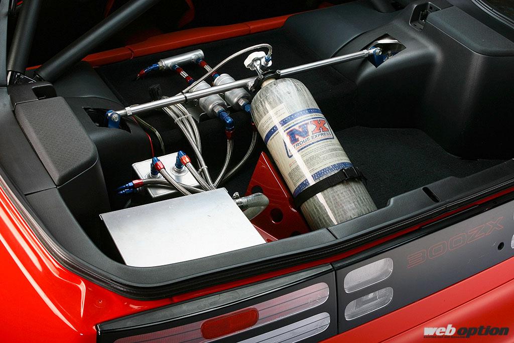トランク部に美しくマウントされたNXボトル。ちなみに噴射条件は、スイッチ切り替えによってスロットル全開時に自動噴射、またはプッシュボタン操作での手動噴射を選ぶことができる。