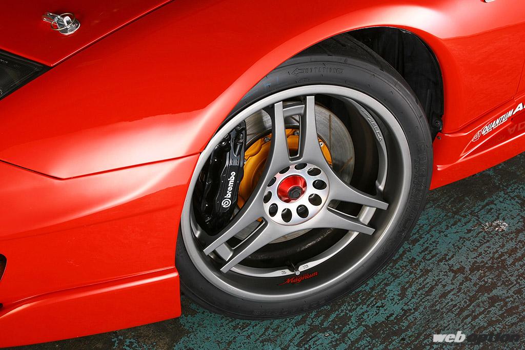 ホイールはトライアルオリジナルのトライフォースゼルダマグナム。サイズはフロント8.0J+32、リヤ9.0J+38だ。これに組み合わされるのがフロント235/40-18のダンロップD01J、リヤ265/35-18のポテンザRE540S。