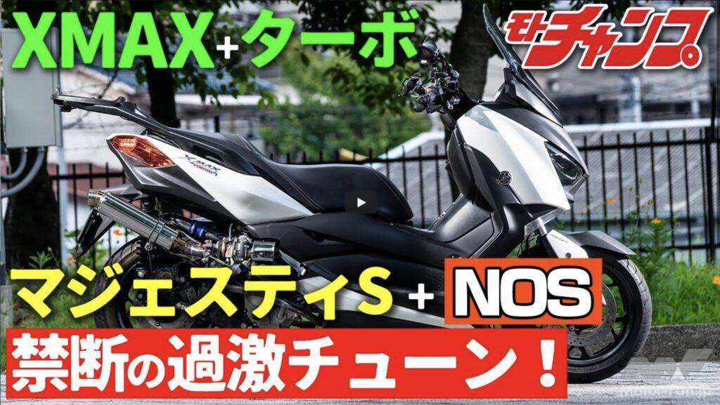 スクーターに速さを求めるなら、ボアアップなどのチューニングが一般的だろう。国内だけでなく台湾などのメーカーがリリースしているボアアップキットがたくさんあるため、手軽に楽しめるチューニングであるともいえる。ただ、ボアアップだけでなくストロークアップやヘッドチューニングを繰り返してきたヘビーユーザーなら、その先に突き進みたくなるはず。ターボやスーパーチャージャーなどの過給機や、ニトロなどと呼ばれる亜酸化窒素をエンジンに噴射して燃焼室内の効率を大幅に引き上げるNOSなどが存在するからだ。大阪府摂津市にある2輪車の販売から修理、カスタムまで手掛けるサワダサイクルは、このように過激なチューニングも引き受けてくれる老舗ショップ。そこで今回は同店が製作した過激なスクーターを2台紹介したい。モトチャンプが取材して誌面に掲載しつつ、ユーチューブで無料配信しているモトチャンプTVにも2台を紹介する動画がアップされている。今回は「XMAXのターボ仕様とマジェスティSのNOS仕様をテストライド」という動画から、どのようなチューニングが行われたのか探ってみたい。
