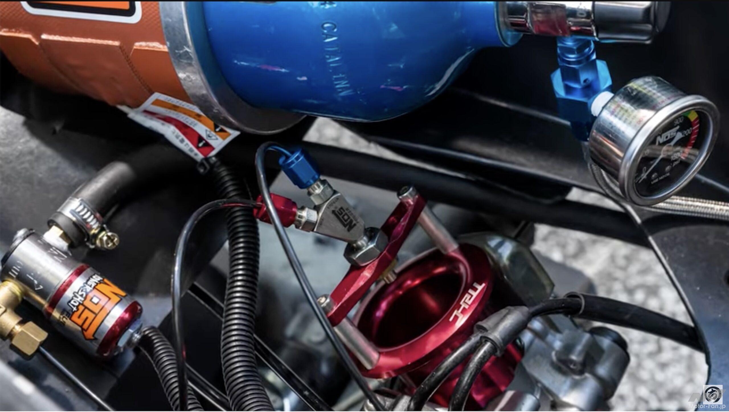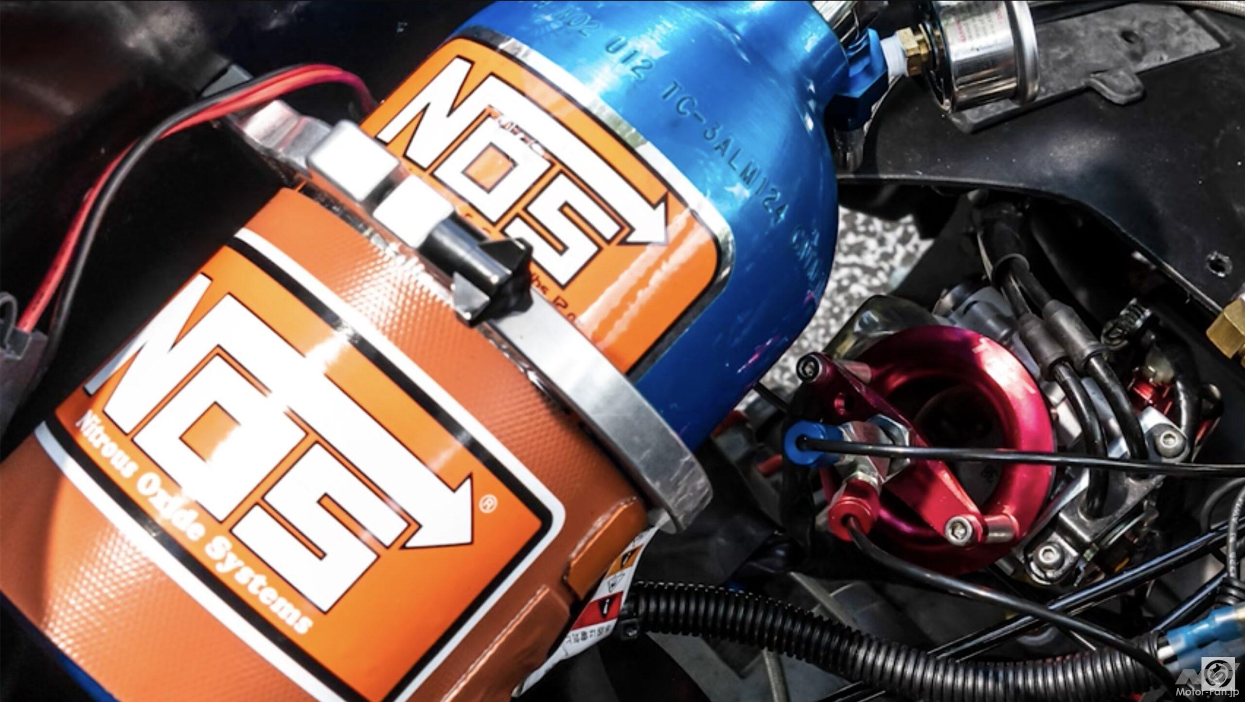 NOSとはナイトラス・オキサイド・システムの略で亜酸化窒素(N2O)をインテークに噴射することで大幅なパワーアップを実現させるシステム。N2Oは通常の空気より酸素分圧が高いため、燃焼室内で爆発する混合気の燃焼効率を引き上げることが可能になる。ターボなどにより多くの空気を過給するのと似た効果が得られるもので、N2Oは気化する際に温度を下げる特性があることから、冷却装置を必要としない利点がある。システムにはインテークマニホールドへN2Oガスを噴射するドライショット、ガスと燃料を同時に噴射するウエットショット、シリンダーを加工してエンジン内へ直接ガスを噴射するポートショットなどの方式がある。今回のマシンでは当初、ドライを試して思った以上の効果が得られなかったことからウエットに切り替えられた。