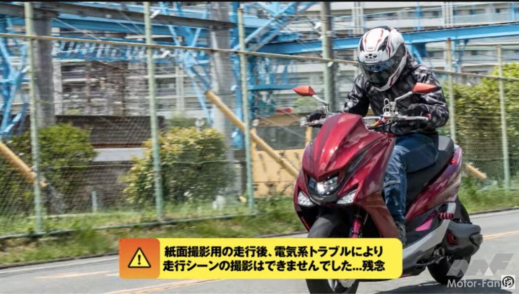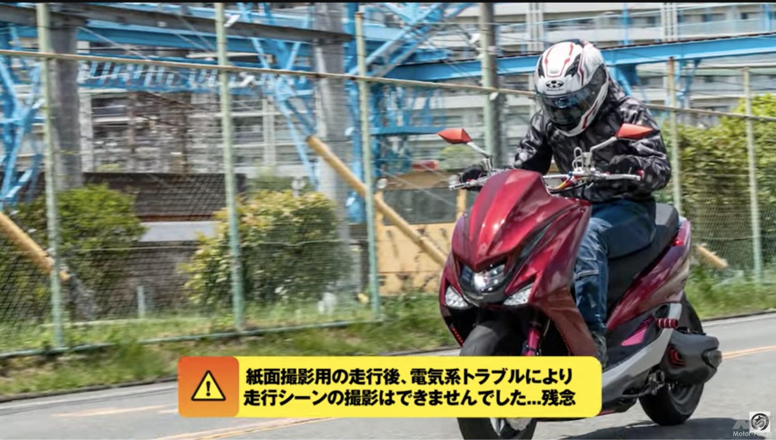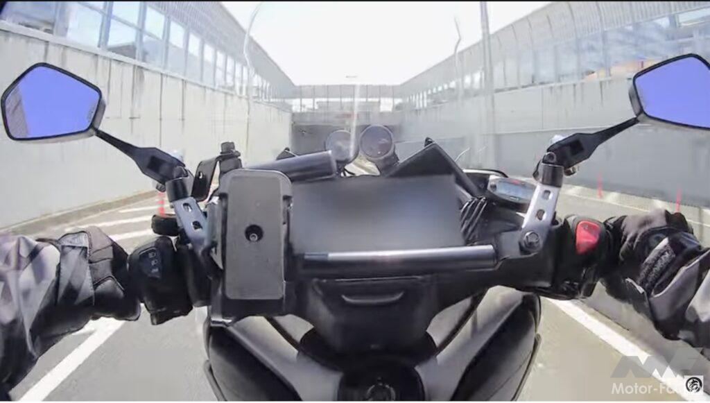 動画ではマシンの説明をする前に、いきなり試乗シーンから始まる。ライダー目線のカメラなためブーストがかかった時の様子までは分かりにくいが、速度の伸びが普通の250ccスクーターの比でないことは一目瞭然。試乗しているHIDE川島が興奮気味に「なにこれ」「気持ちいい」と語りターボによるパワーアップが伝わってくる。