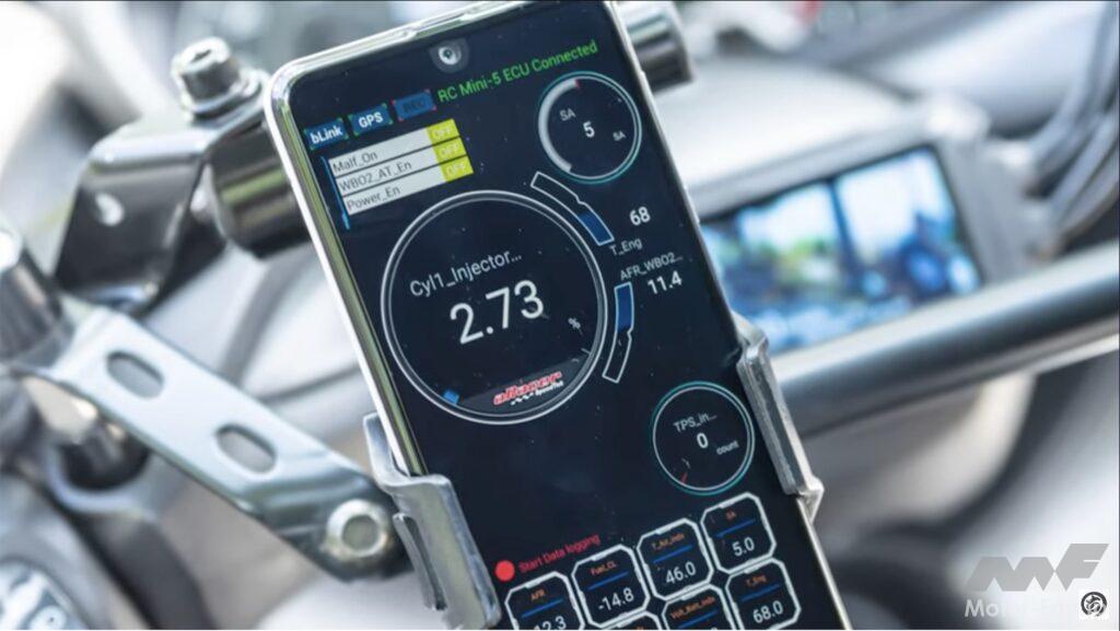 使用したタービンは軽自動車用を利用したサワダサイクルオリジナルのキット。250ccであれば軽自動車用で十分であり、それ以上大きなタービンだと排気圧力が足りないためタービン自体を回すことができない。またXMAXの排気量に合わせて過給圧を調整するアクチュエーターのセッティングが不可欠になるため、独自のノウハウが必要になるキットといえるだろう。またターボ化により燃焼温度が上がるため、安定してハイパワーを得るならインタークーラーも必需品。ステップ周囲に取り付けて違和感なく効果的な冷却性を得ている。組み上がったターボマシンはaRacerにより制御しているが、当然セッティングが不可欠。そこでオーナー自ら走るたびにスマホでセッティングを繰り返して完成させた。ターボ化によりメンテナンスの頻度は高くなるものの、もたらされる喜びはそれを上回るものだろう。以前はリッターバイクに乗っていたこともあるオーナーだが、ターボ仕様XMAXはシフトチェンジ不要でラクなうえに速いと良いこと尽くし。これは楽しそうだ!