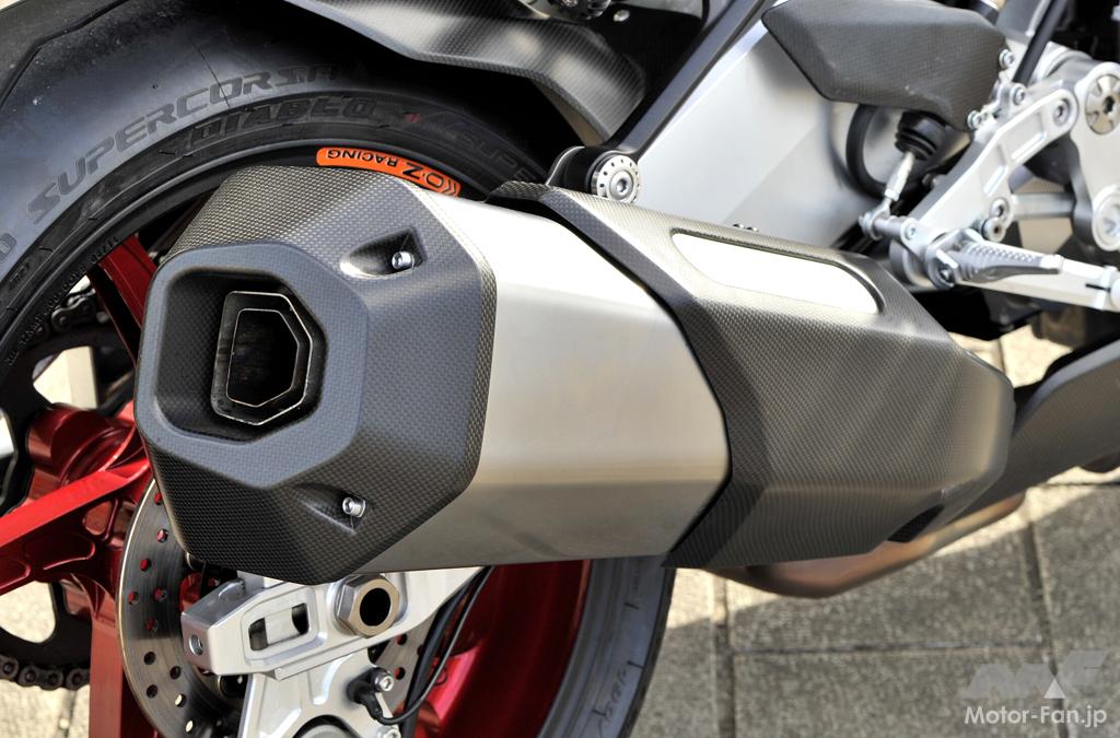 モデル名:KB4 全長×全幅×全高:2,050mm×774mm×1,150mm 軸間距離:1,390mm 最低地上高:140mm シート高:810mm(+/-8mm) キャスター/トレール:24.0°/100.8mm エンジン種類/弁方式:水冷4ストローク並列4気筒 / DOHC 4バルブ 総排気量:1,043cm³ 内径×行程/圧縮比:77.0mm×56.0mm/11.8:1 最大出力:104.5kW(142PS)/10,000rpm 最大トルク:111N・m(11.3kgf・m)/8,000rpm 始動方式:セルフスターター 点火方式:バッテリ&コイル(トランジスタ点火) 潤滑方式:ウェットサンプ エンジンオイル容量:4.0L 燃料供給方式:フューエルインジェクション 燃料タンク容量:19.5L トランスミッション形式:常噛6段リターン クラッチ形式:湿式多板 ギヤ・レシオ: 1速:2.600(39/15)/2速:1.950(39/20)/3速:1.600(24/15) 4速:1.389(25/18)/5速:1.238(26/21)/6速:1.107(31/28) 一次減速比/二次減速比:1.627(83/51)/2.733(41/15) フレーム形式:トレリス サスペンション: 前|オーリンズ FG R&T 43 NIX30 後|アルミ削り出しスイングアーム、オーリンズ TTX36 ホイールトラベル: 前|130mm 後|122mm タイヤサイズ: 前|120/70ZR17 後|190/50ZR17 ホイールサイズ: 前|17M/C×MT3.50 後|17M/C×MT6.00 ブレーキ形式: 前|デュアルディスク 320mm (外径) 後|シングルディスク 220mm (外径) 車両重量:194kg 乗車定員:1名 生産国:イタリア共和国 メーカー希望小売価格:4,378,000円(本体価格 3,980,000円、消費税 398,000円)