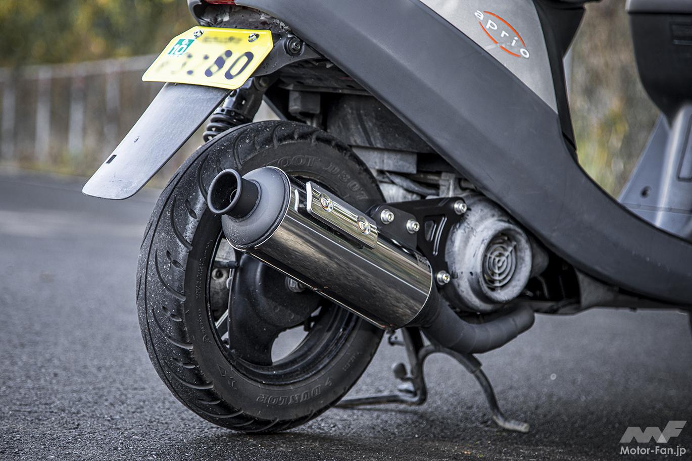 「発進時にスロットルをガバ開けするとフロントタイヤが少しだけ浮くようになりました。お目当ての峠道でも速度をキープどころかグイグイ加速してくれるし、幹線道路では中速域からの伸びが良くなった! しかもノーマルタイプマフラー時に73.95km/hだった最高速は、83.57km/hとおよそ10km/hアップ。排気音は前よりも少し大きくなったけれど、レーシングチャンバーのような“いかにもチューニング車”な音量&音質ではないので、ご近所さんに白い目で見られることはないと思われます。普通のルックス(と音)のお買い物バイクなのにちゃんと速いので、普段使いに重宝してくれそう」