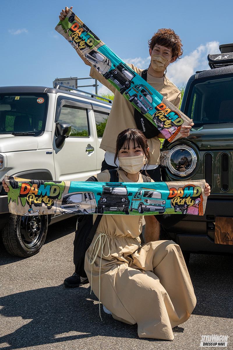 ルーフラックやオーニング等外観の雰囲気、居住スペースのキレイな仕上げなど、見た目もカワイく、そしてキレイなまなとさん、かなえさんの愛車ハスラー。奥様のクルマを買い替える時、「このクルマがカワイイ!」とダムド『カラビナ』にひと目惚れ!! カーキの色もイイ感じだし、アウトドア風の仕上げも似合っている。「カラビナの勝利だね」とかなえさん。この日は釣り仕様でコーディネイト。車中泊しながら、時々魚をさばくイメージ(実際に釣りは趣味)。お二人はYouTubeもやっているそうで、だから(!?)“魅せる演出”もお手のモノなのです!