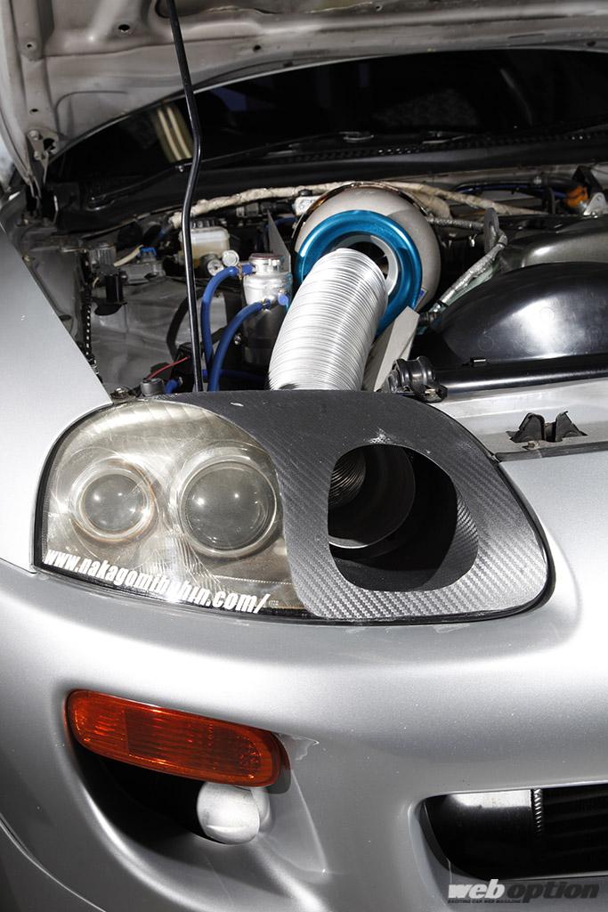 運転席側のヘッドライトはハイビーム位置を加工し、フレッシュエアをダイレクトにタービンへと引き込めるようにダクト化。スパルタンな顔付きを演出している。