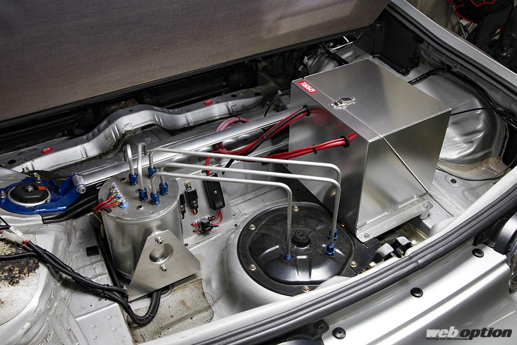 オーバーハングの重量物となるバッテリーはトランクへと移設。その他、コレクタータンクをはじめとする燃料系パーツもここに集約させている。
