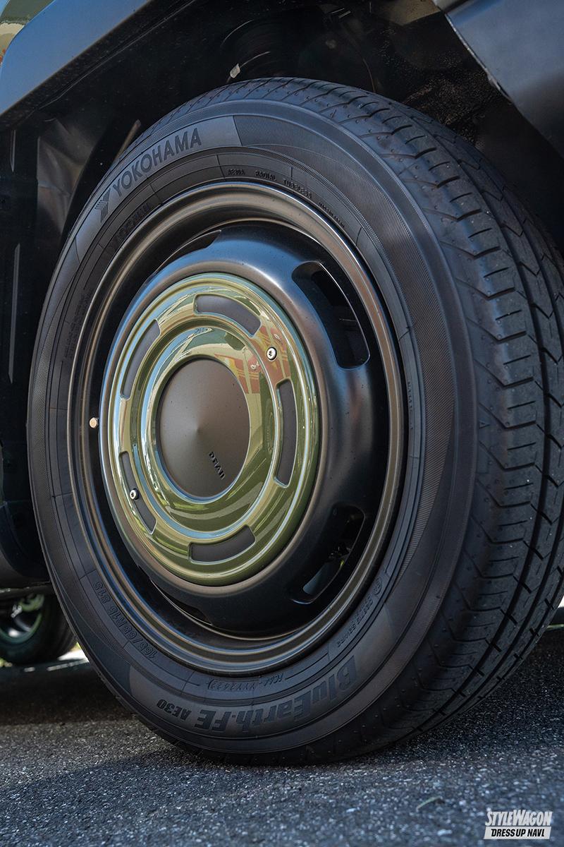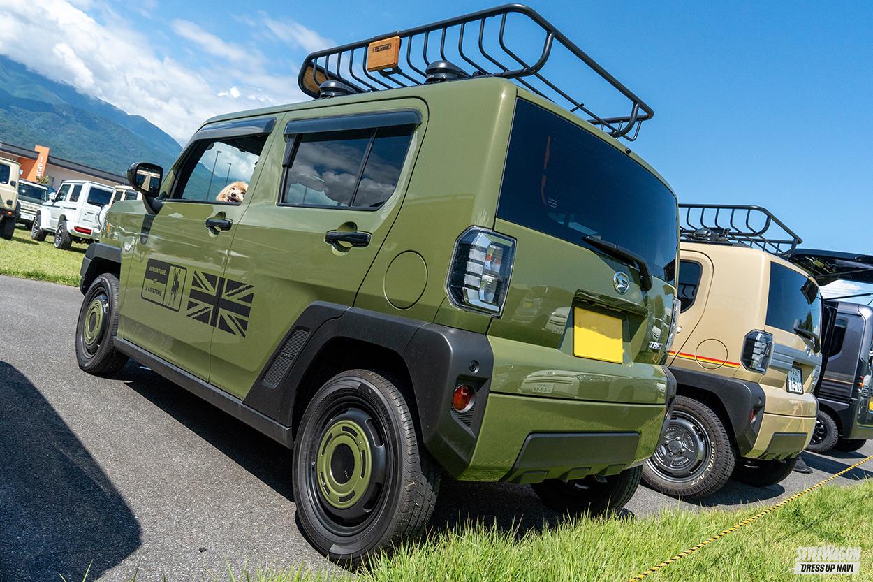 軽カーは丸目が多いが、四角ライトだったのもタフトに決めた理由のひとつ。ダムドのデモカー『リトルD』に惚れ込み、ホイールも「デモカーと同じにして」とオーダーしたそうだ。ルーフバスケットもステッカーもデモカー同様。
