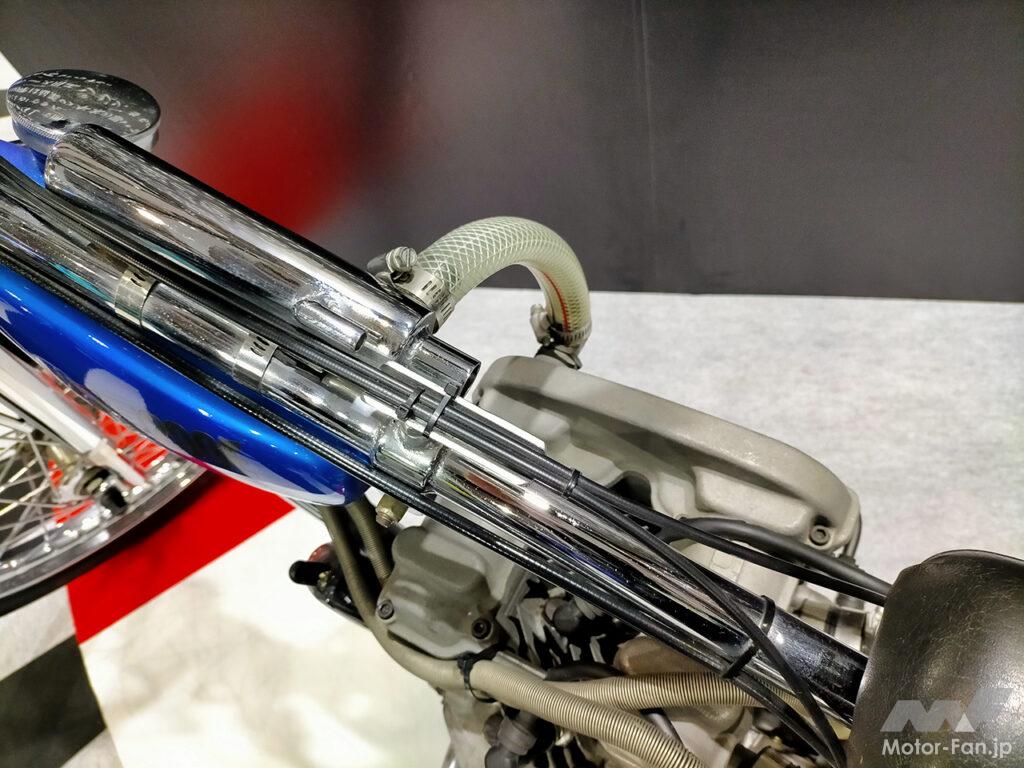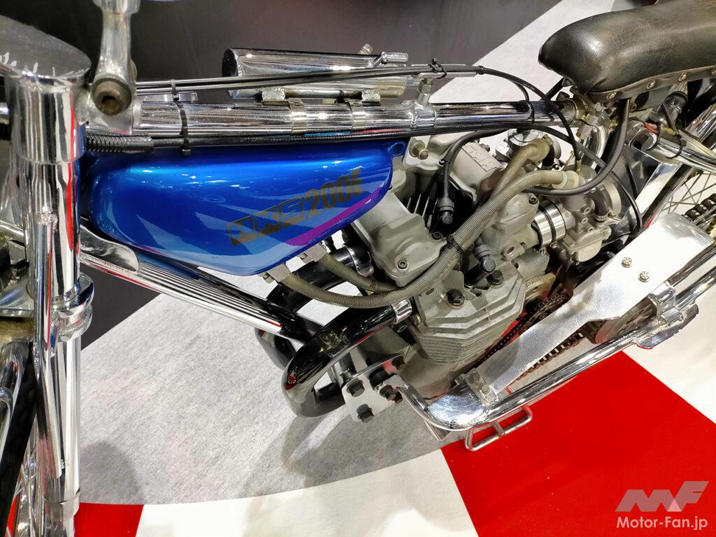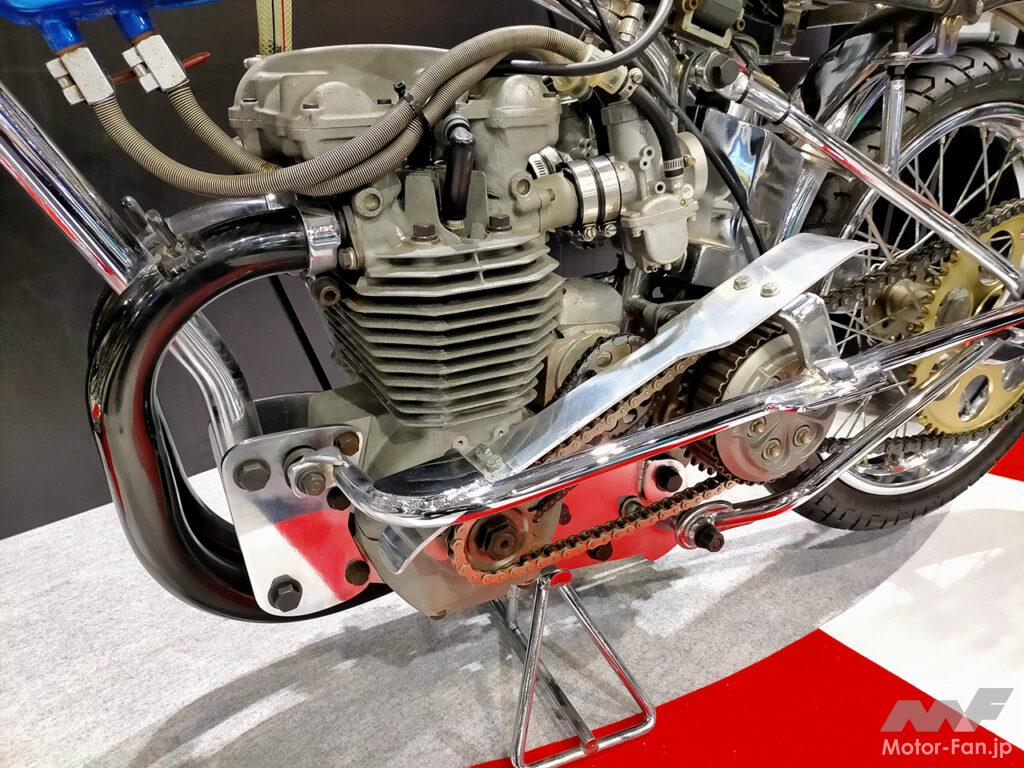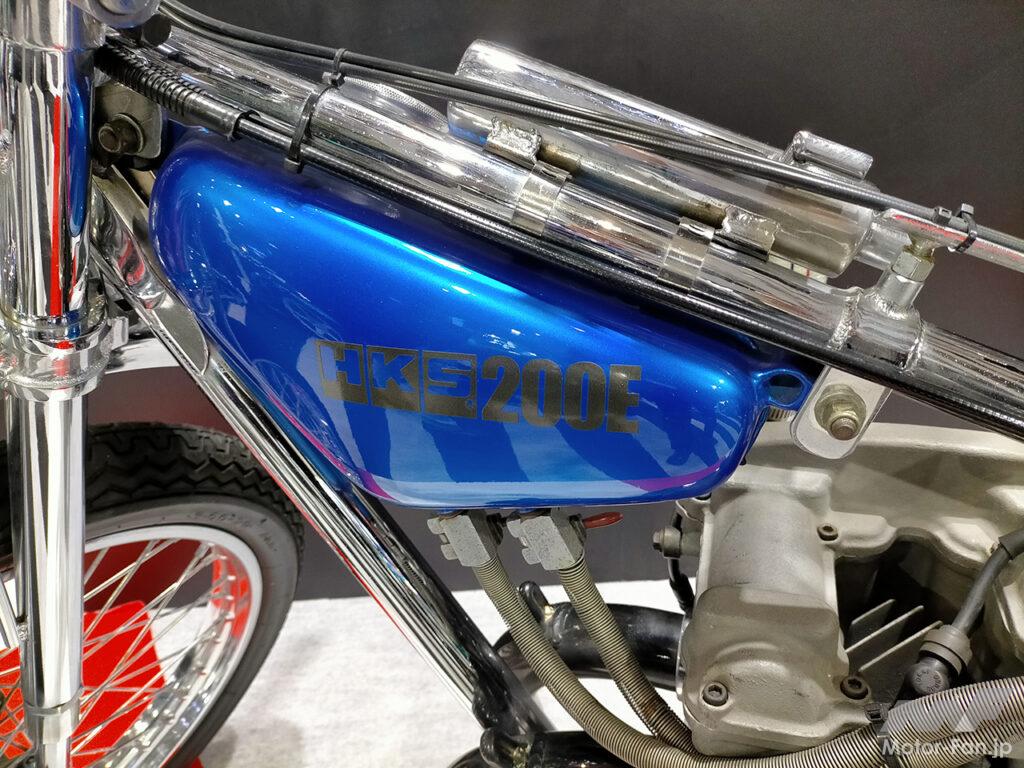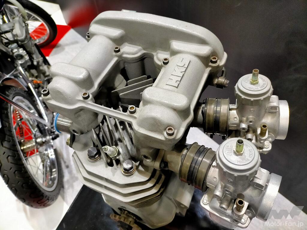 1973年に誕生したHKSは、長年自動車チューニングのパイオニアとして活躍する大手メーカーとして有名。HKSブースに展示された写真のバイクは、HKSが1988年(昭和63年)に開発した、「200E」を搭載したオートレースマシン。